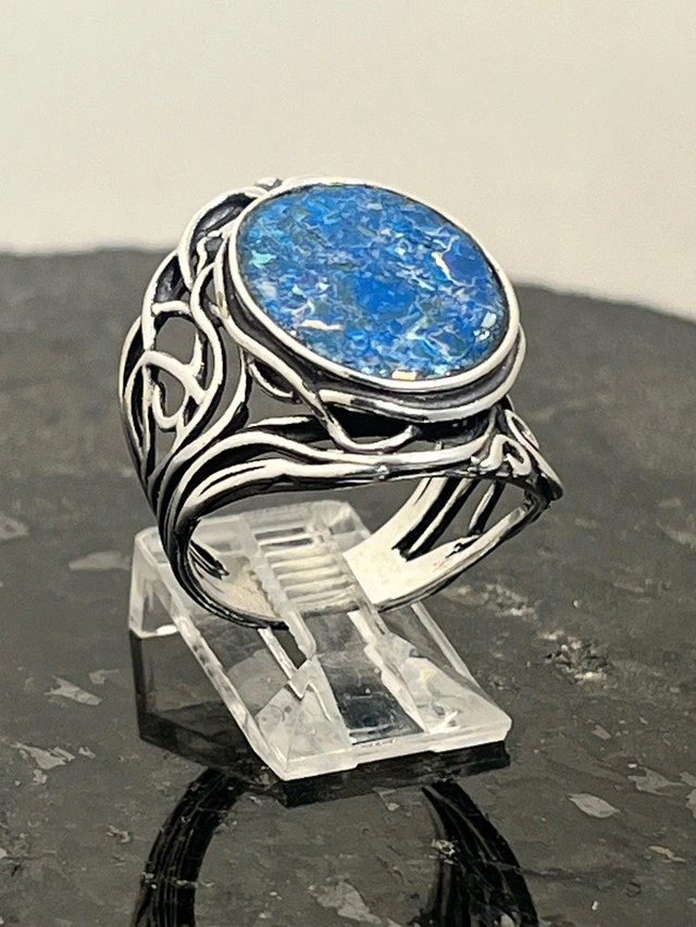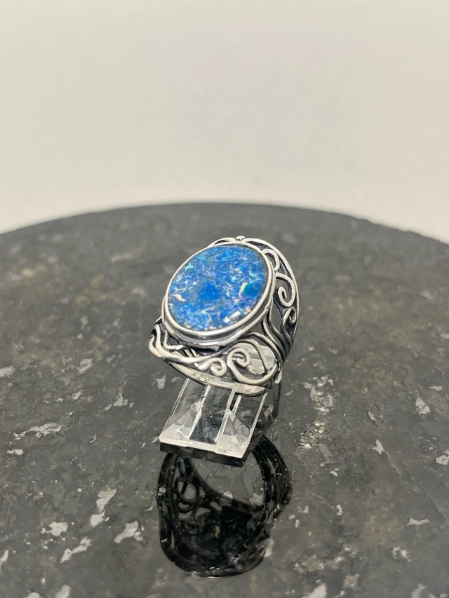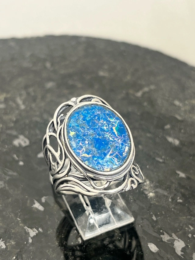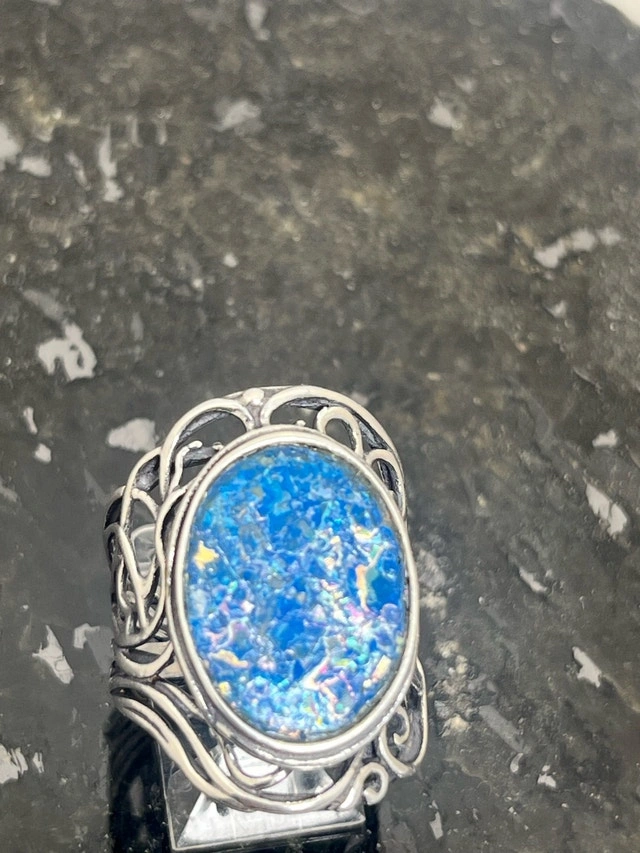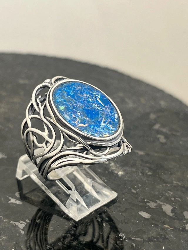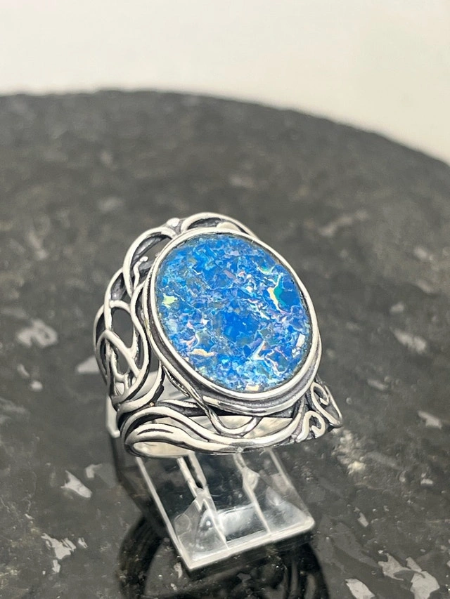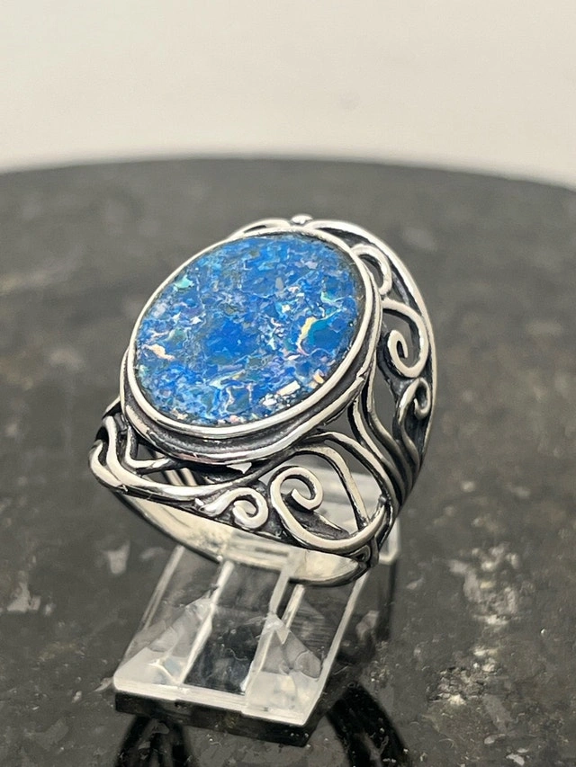 This exquisite, new size 8 ring features a stunning piece of 925 Roman glass, beautifully set in a detailed sterling silver band. The vibrant blue hues and unique cracking pattern of the Roman glass make it a captivating piece. Here are some more details: Metal: 925 Sterling Silver, Gemstone: Authentic Roman Glass, Ring Size: 8, Condition: New. If you've been searching for a unique ring, this Roman glass ring might just be the one for you! It's a piece that seems to whisper tales of ancient artisans and long-lost empires. Don't miss out on owning a piece of history! If the ad is up, it's available!
