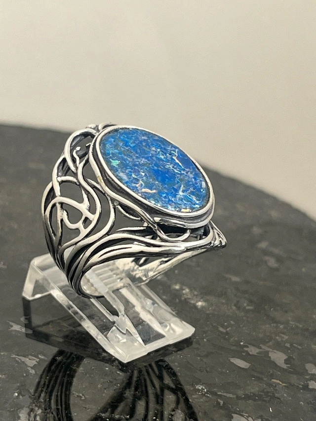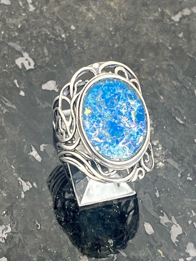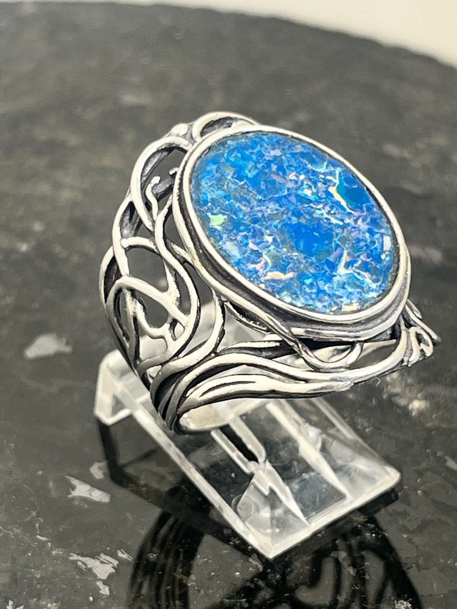 This exquisite, new size 8 ring features a stunning piece of 925 Roman glass, beautifully set in a detailed sterling silver band. The vibrant blue hues and unique cracking pattern of the Roman glass make it a captivating piece. Here are some more details: Metal: 925 Sterling Silver, Gemstone: Authentic Roman Glass, Ring Size: 8, Condition: New. If you've been searching for a unique ring, this Roman glass ring might just be the one for you! It's a piece that seems to whisper tales of ancient artisans and long-lost empires. Don't miss out on owning a piece of history! If the ad is up, it's available!