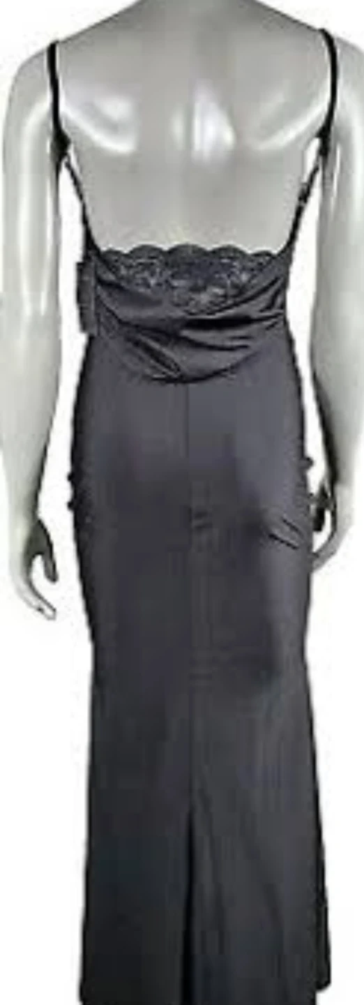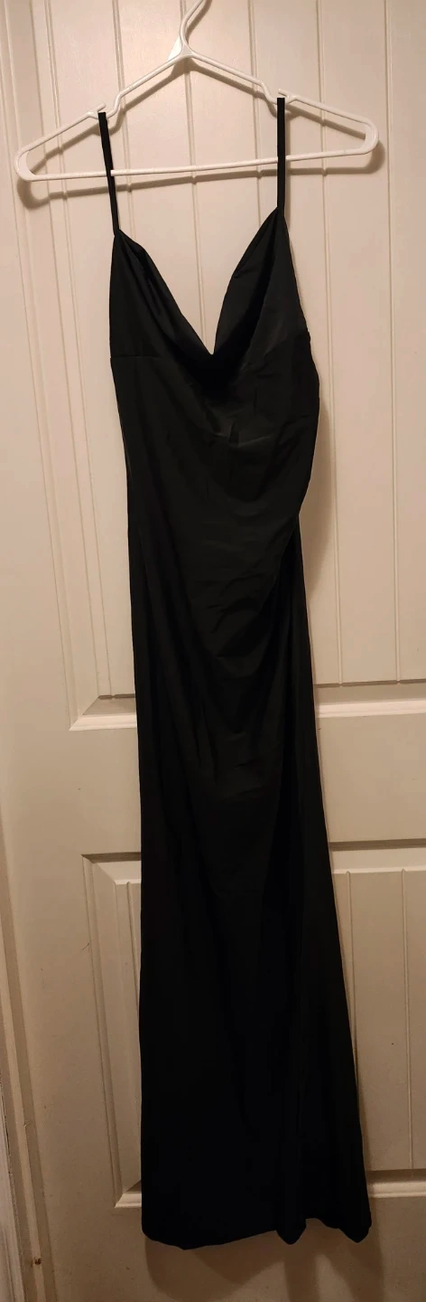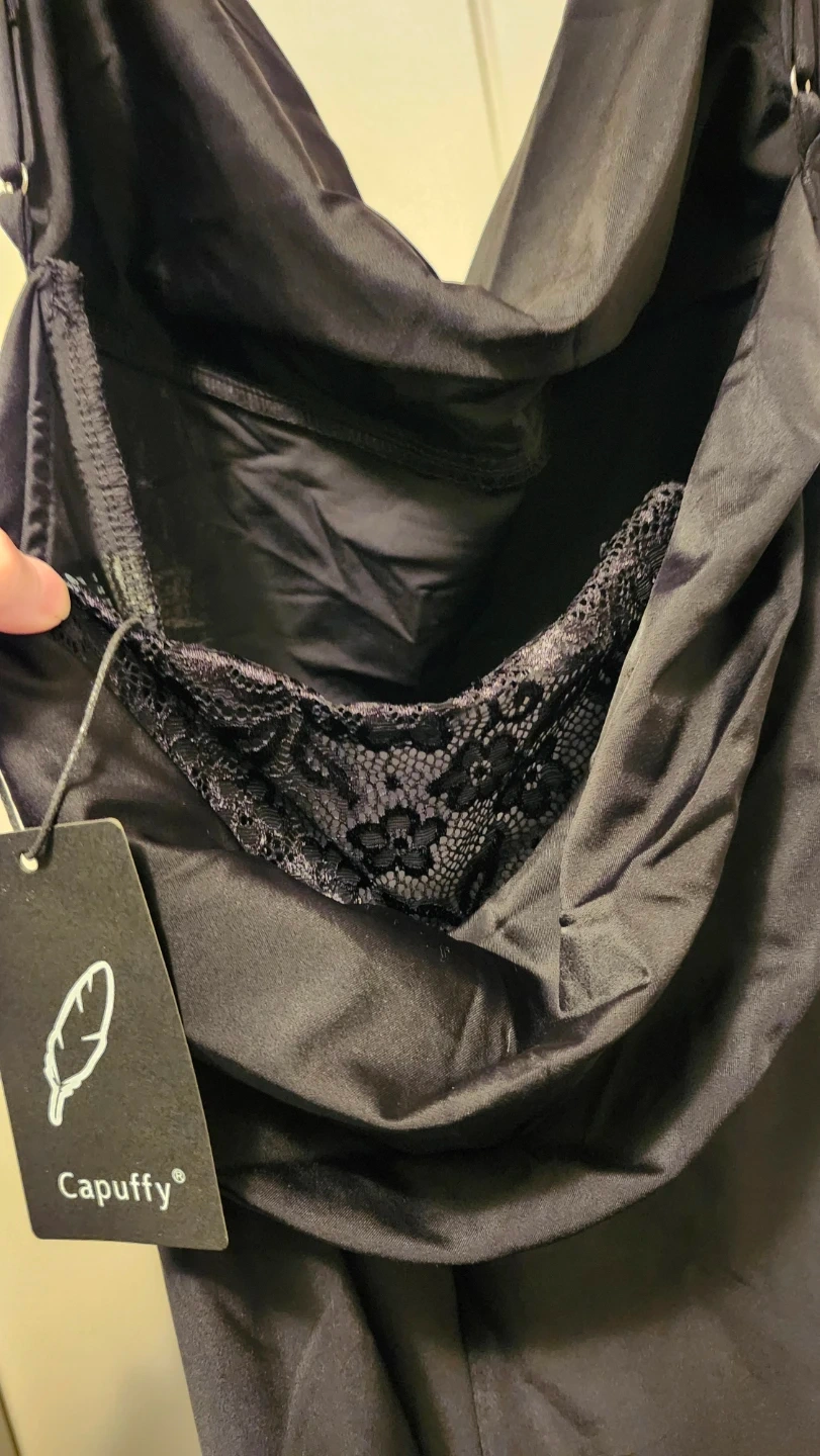 This is a black cowl neck maxi dress from Capuffy. It features lace detailing on the back and has adjustable straps. Made from a satin-like material. Perfect for a formal event!