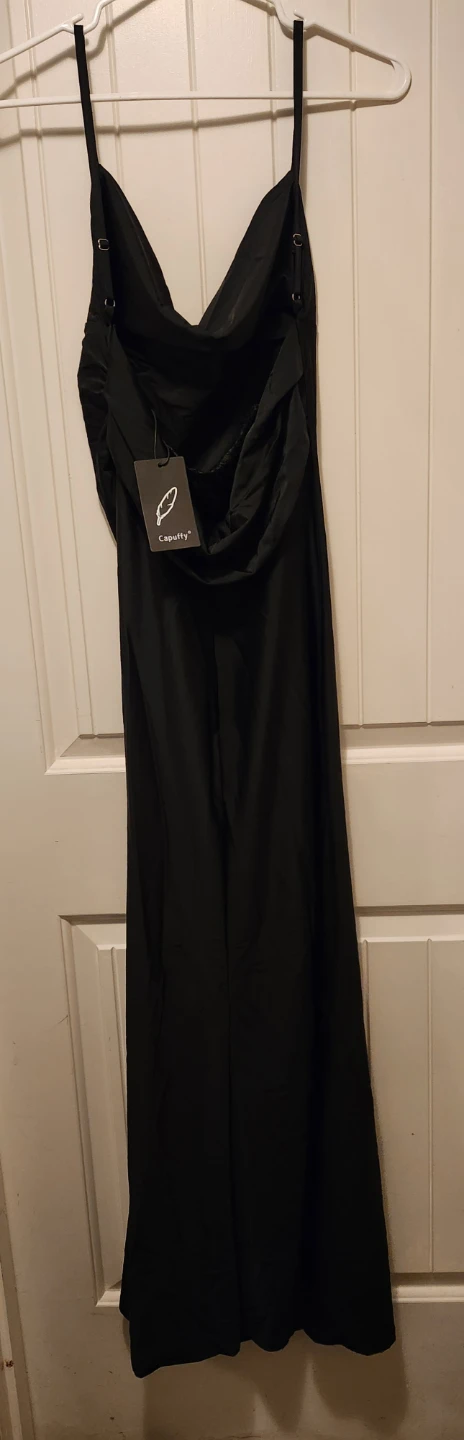 This is a black cowl neck maxi dress from Capuffy. It features lace detailing on the back and has adjustable straps. Made from a satin-like material. Perfect for a formal event!