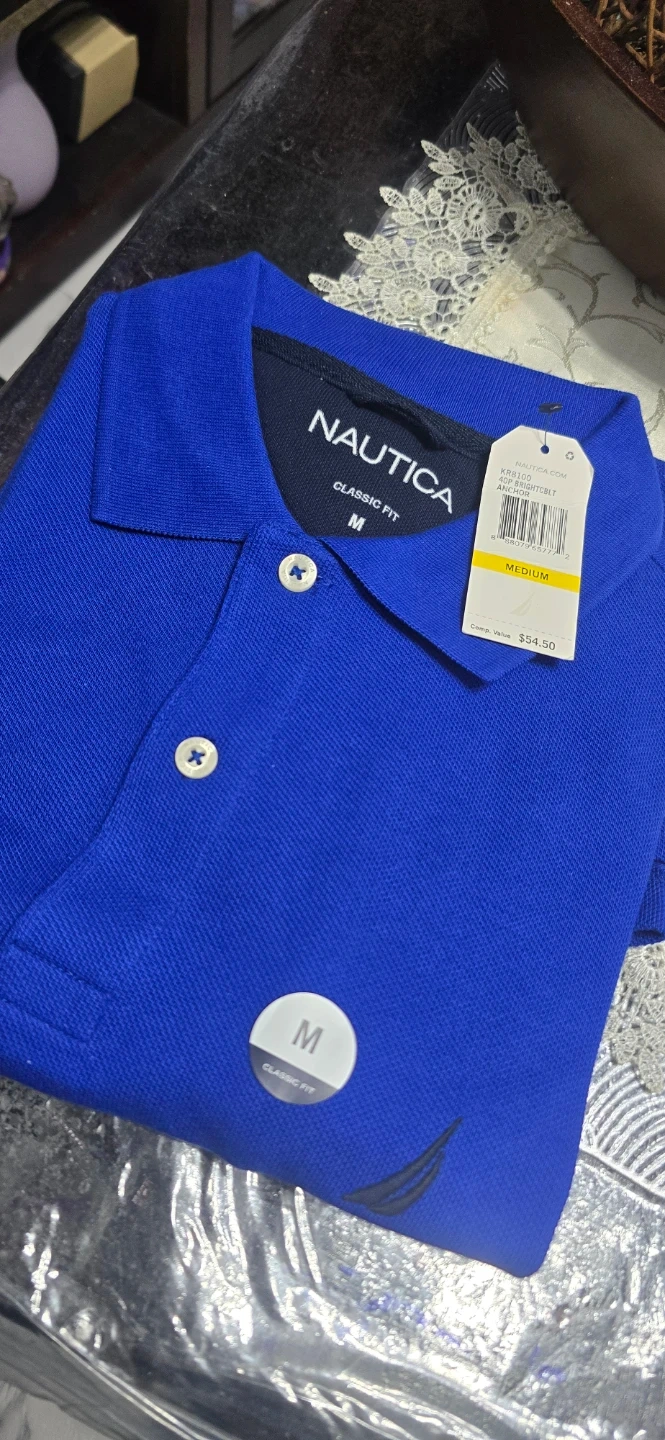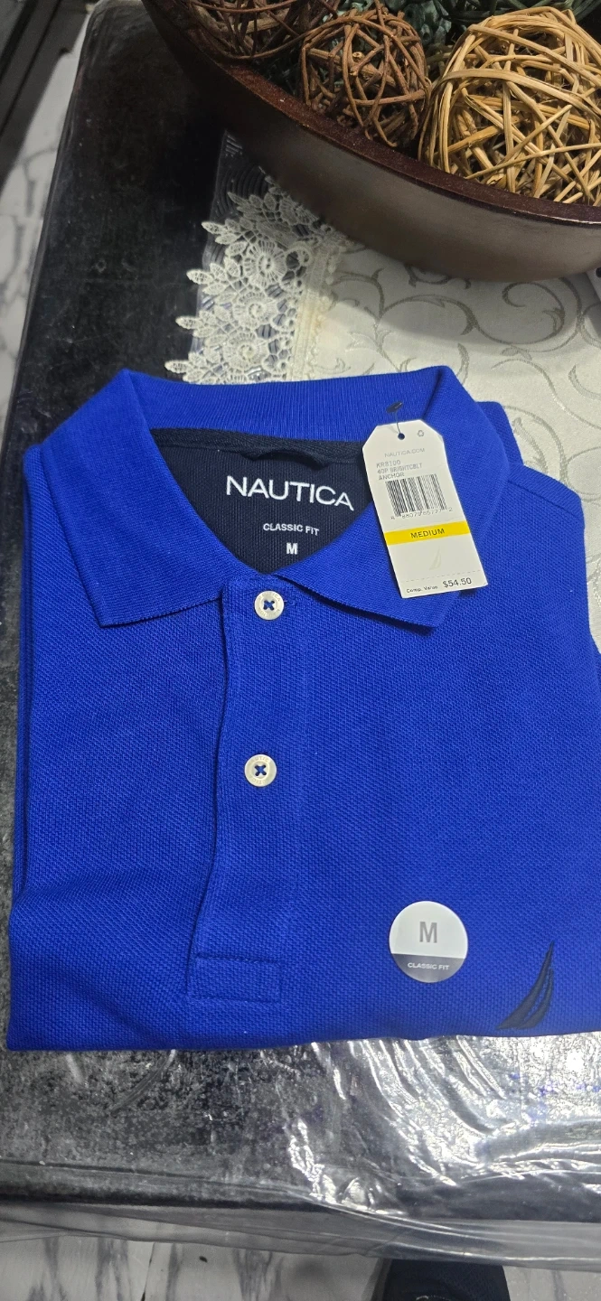 This is a Nautica Classic Fit polo shirt in blue. It's a size medium. The shirt features a classic collar and a two-button placket. Perfect for casual wear!