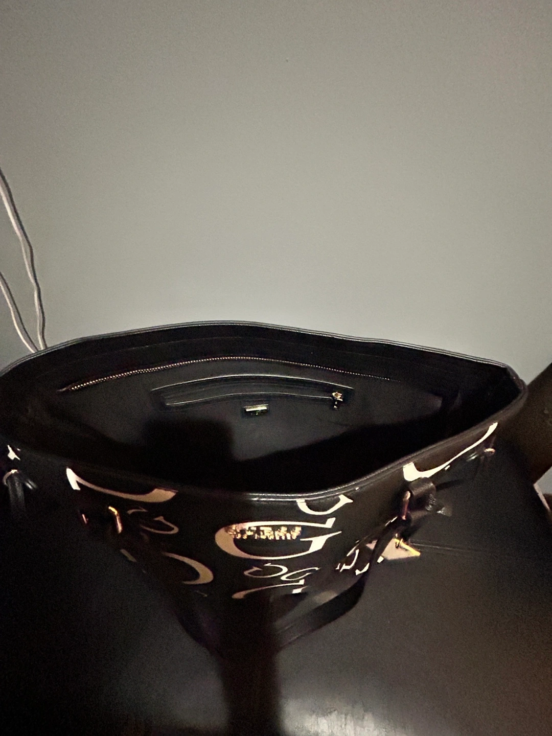 Stylish Guess tote bag. Black with a white Guess logo pattern. Features two shoulder straps and a zipper closure. Roomy interior. Used only a couple times.