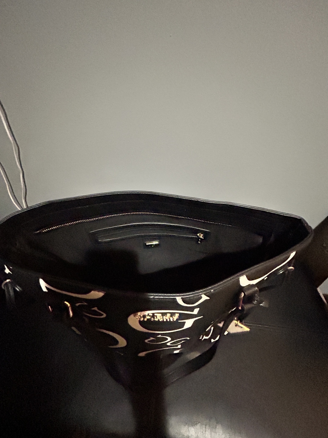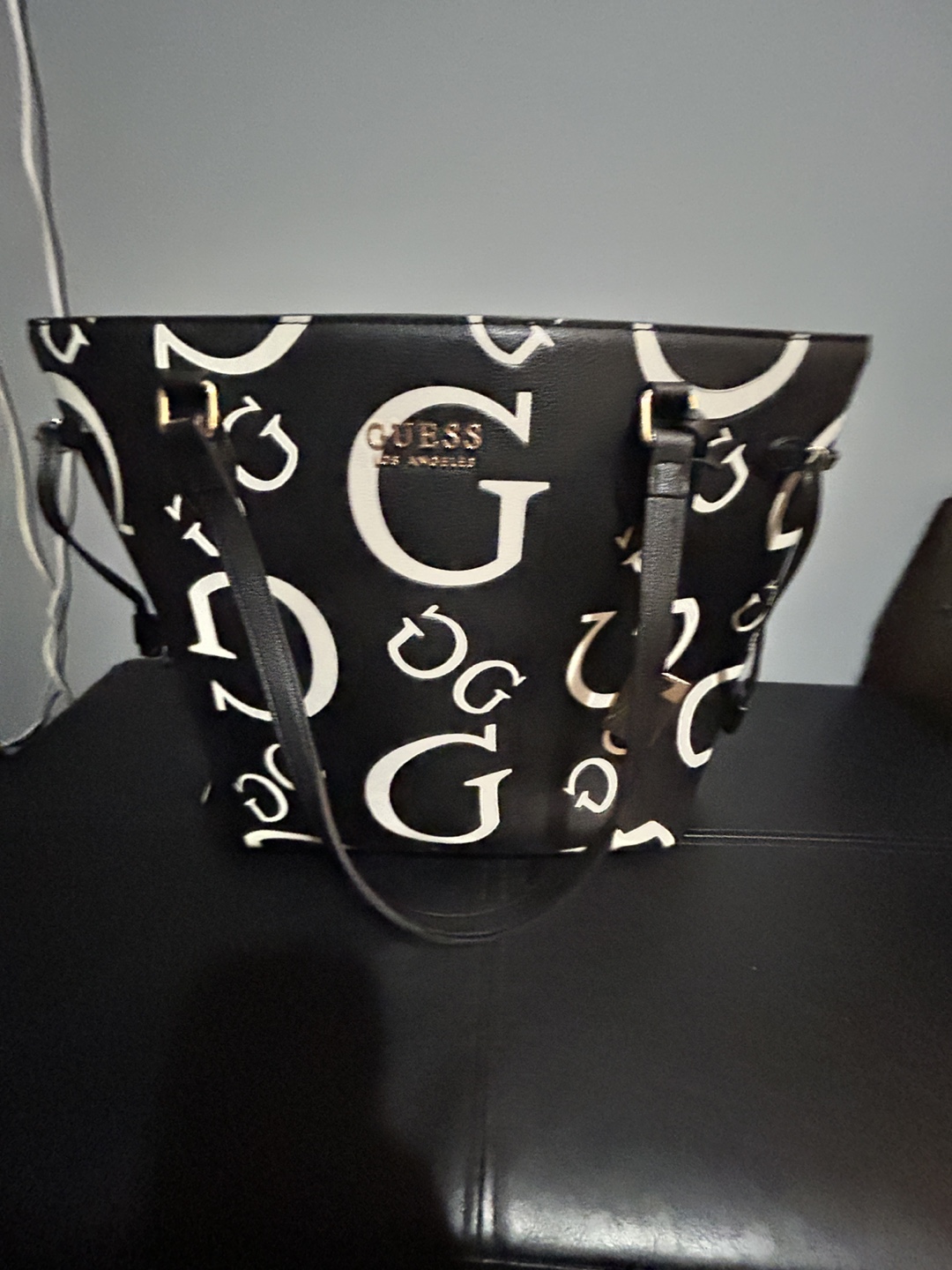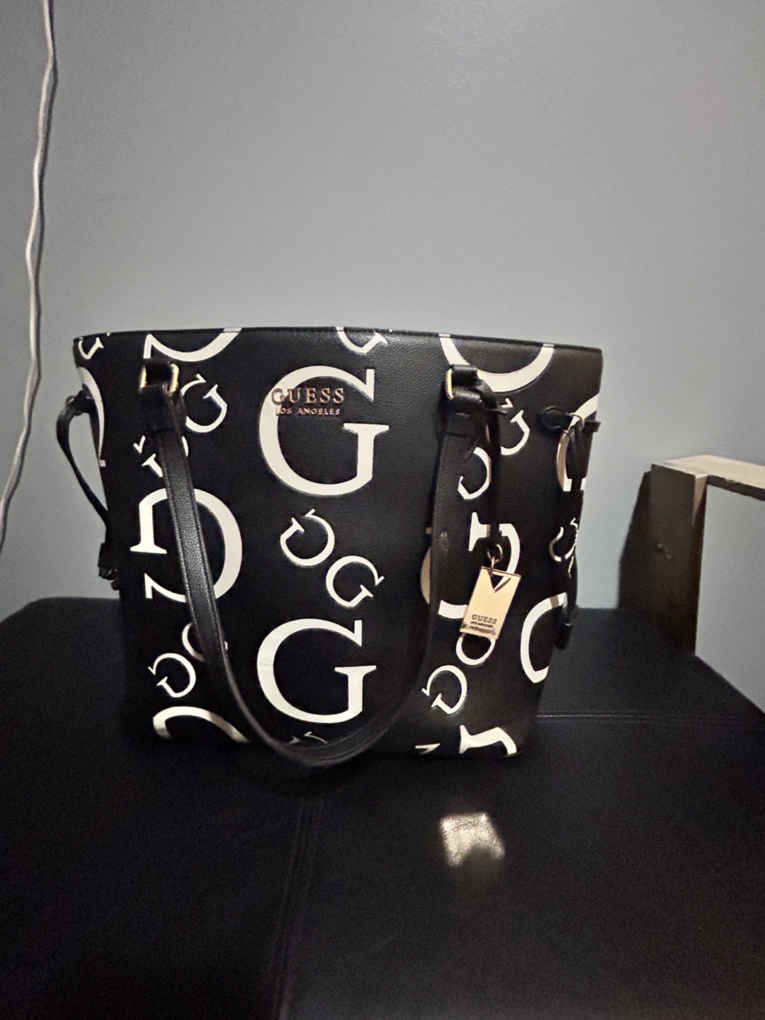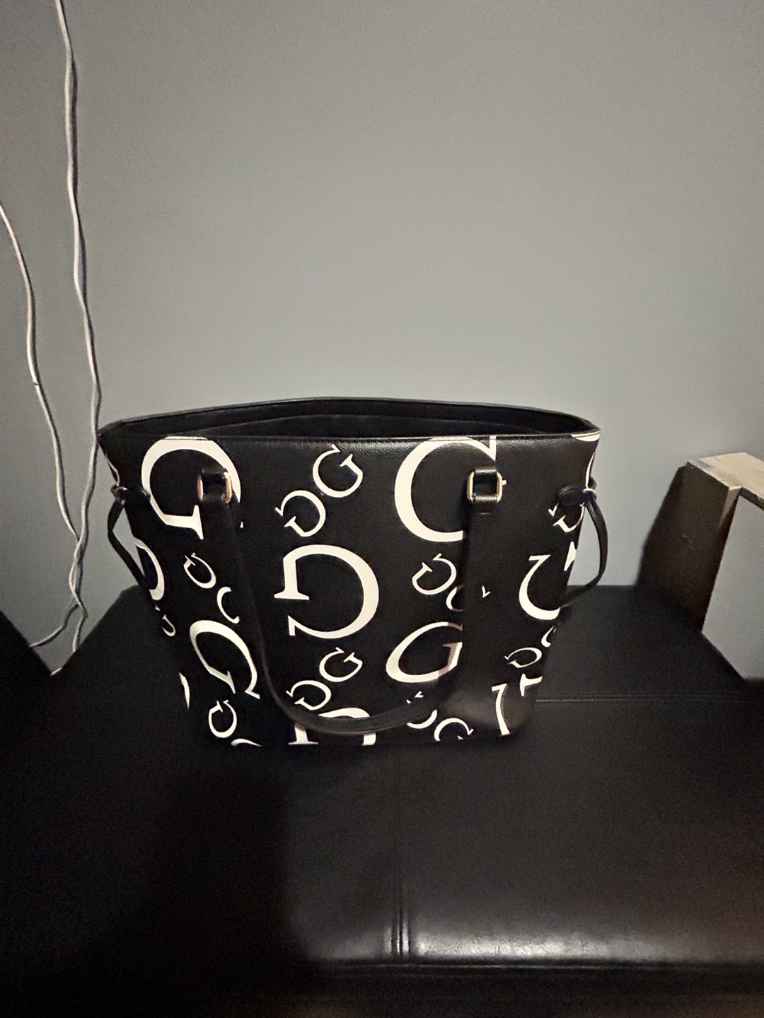 Stylish Guess tote bag. Black with a white Guess logo pattern. Features two shoulder straps and a zipper closure. Roomy interior. Used only a couple times.