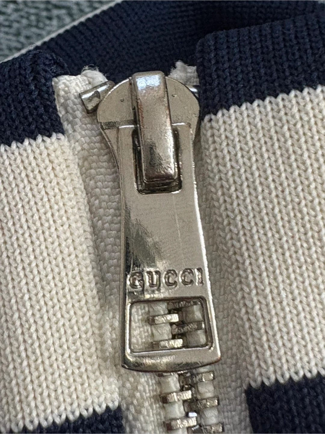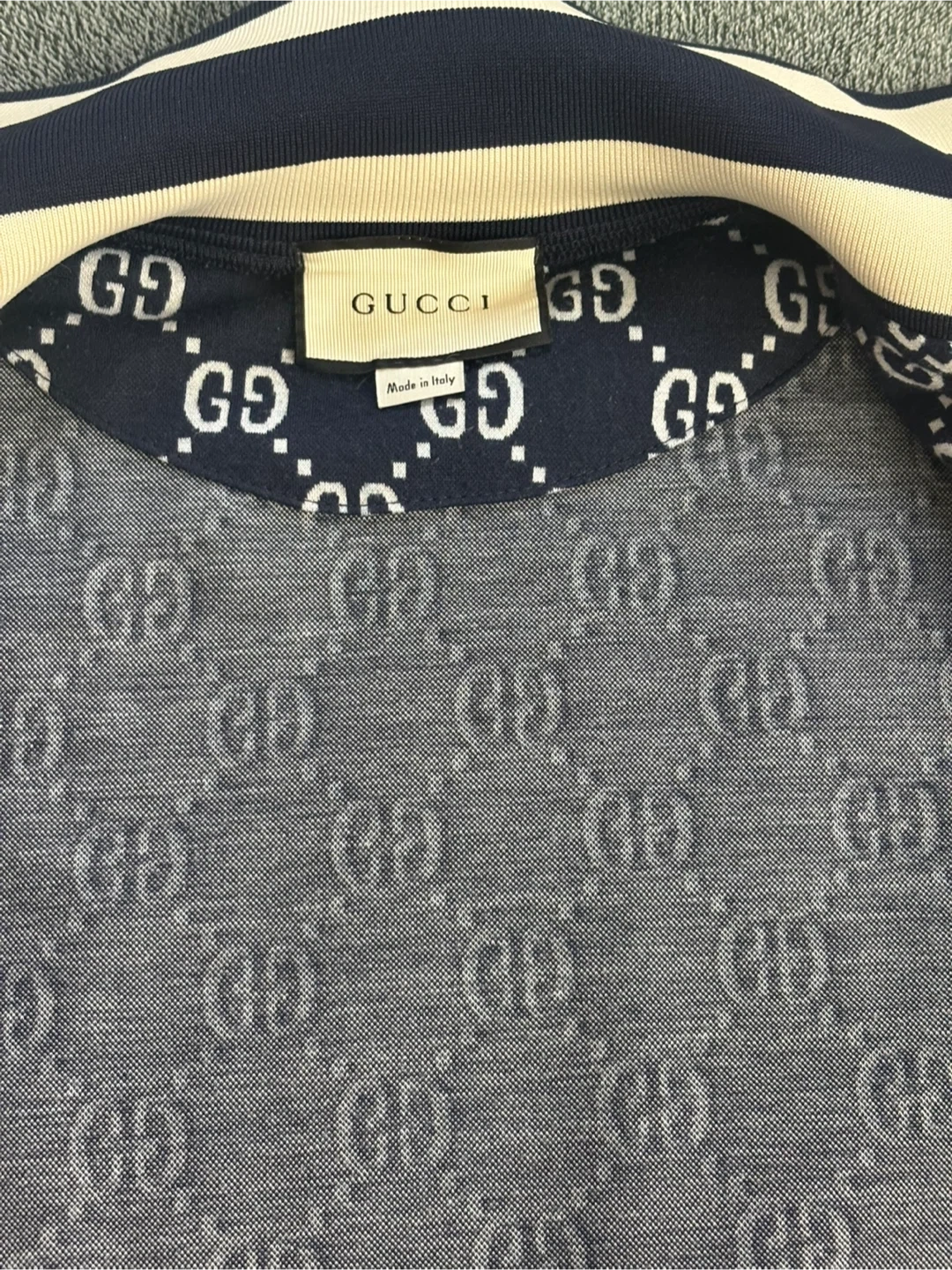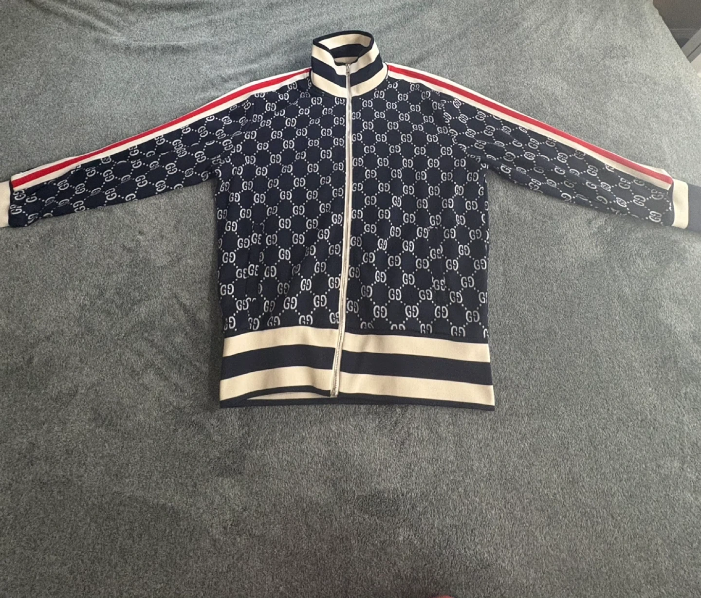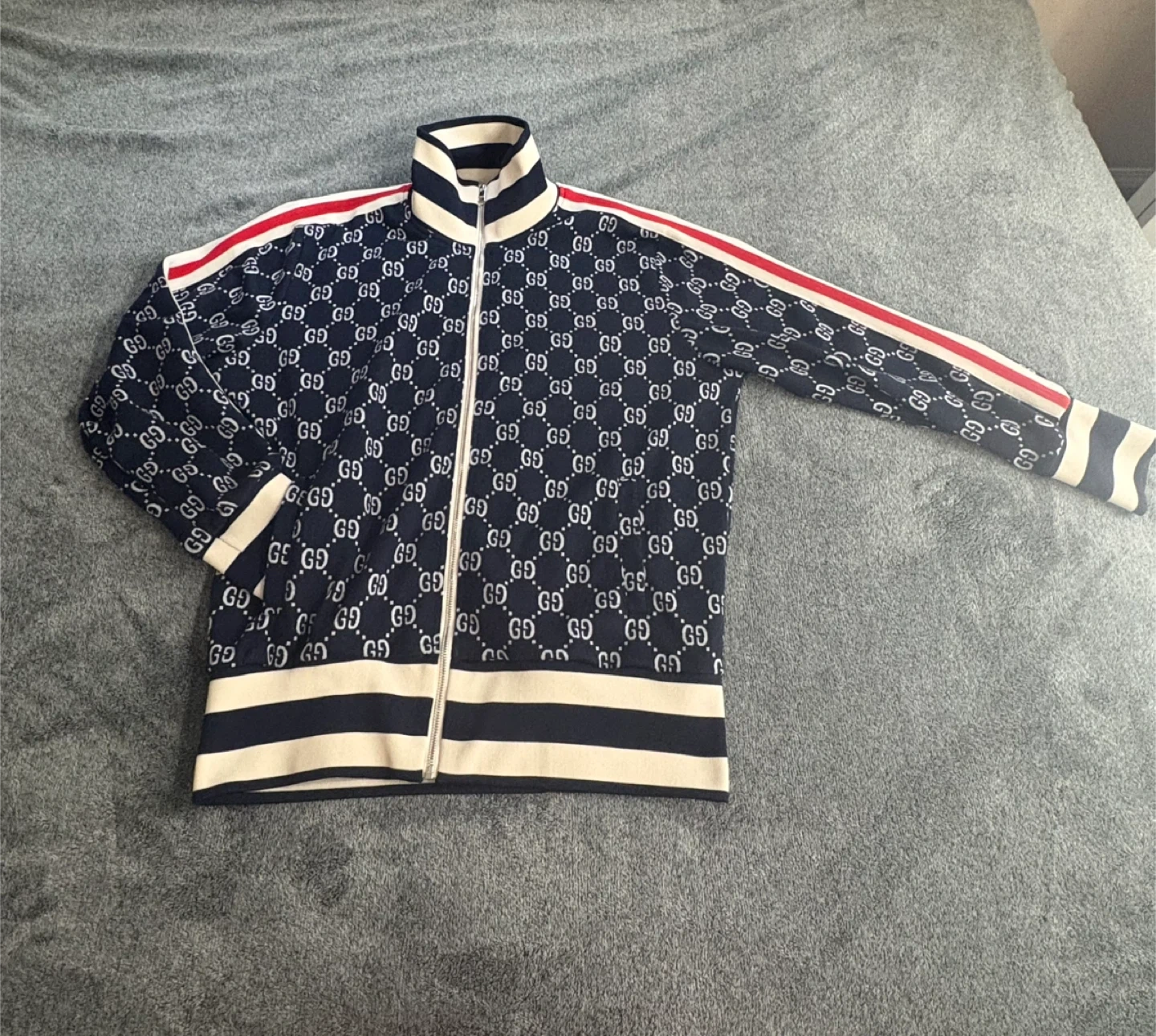 Classic Gucci track jacket featuring the signature GG monogram pattern. It's made in Italy with a full zipper closure and striped details on the sleeves and collar. This piece comes in size XL