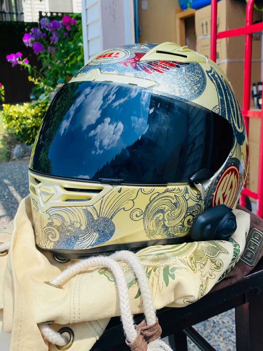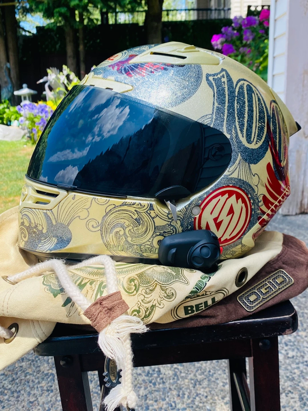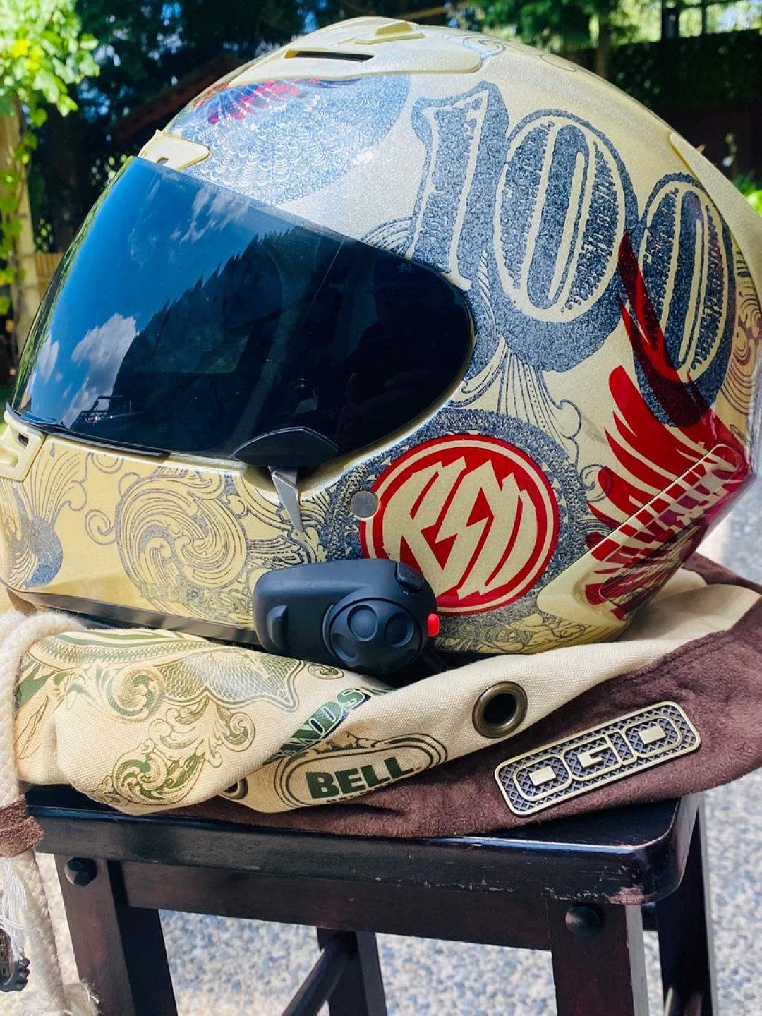Bell motorcycle helmet with a money-inspired graphic design. Features a dark tinted visor and comes with an OGIO helmet bag. It's in great condition for your next ride!