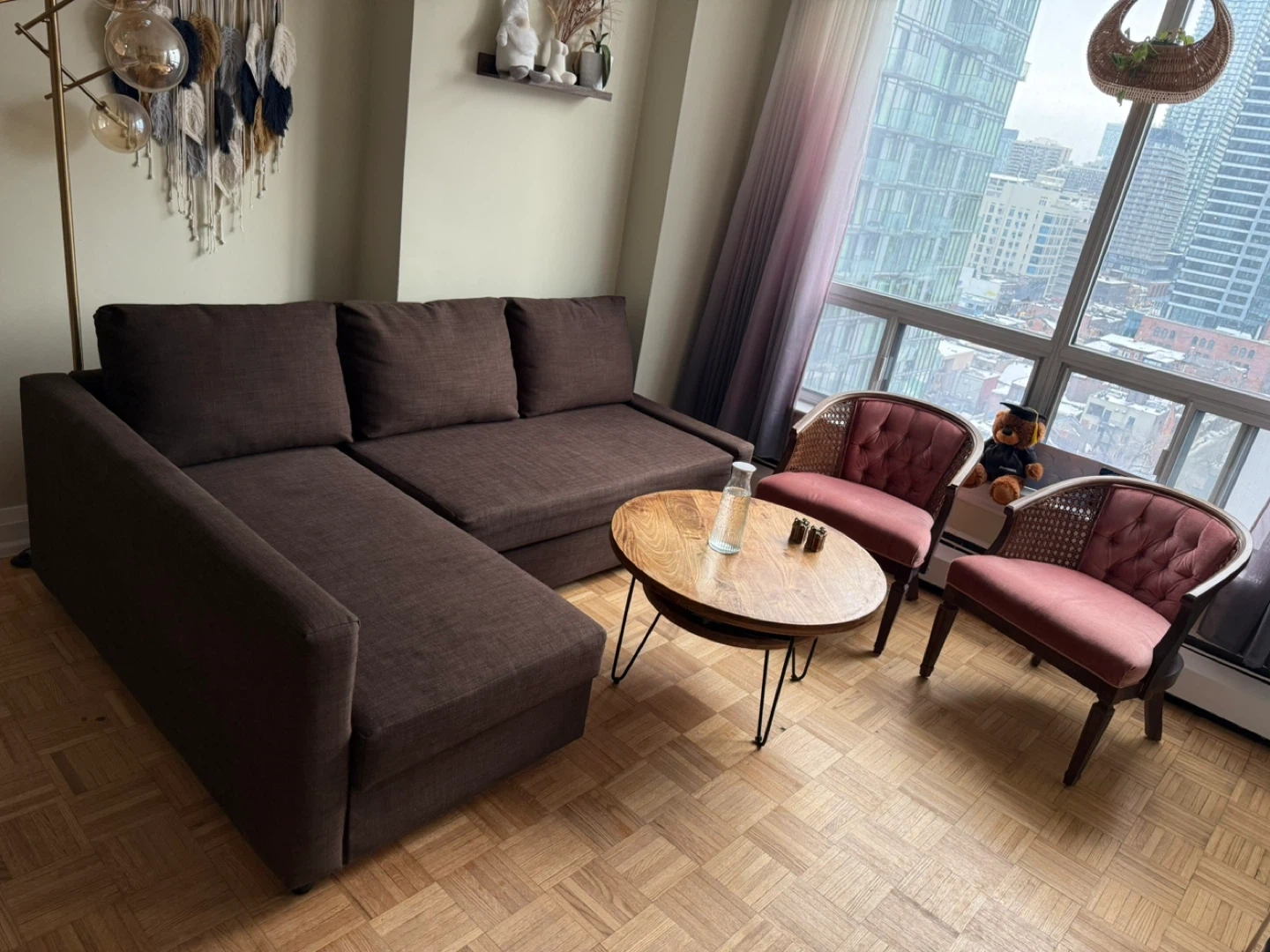 Comfortable L-shaped IKEA sectional sofa with three back cushions. It converts into a full sized bed. Upholstered in a durable brown fabric. It offers ample seating space for your living room. It retails for $1300 + taxes.
