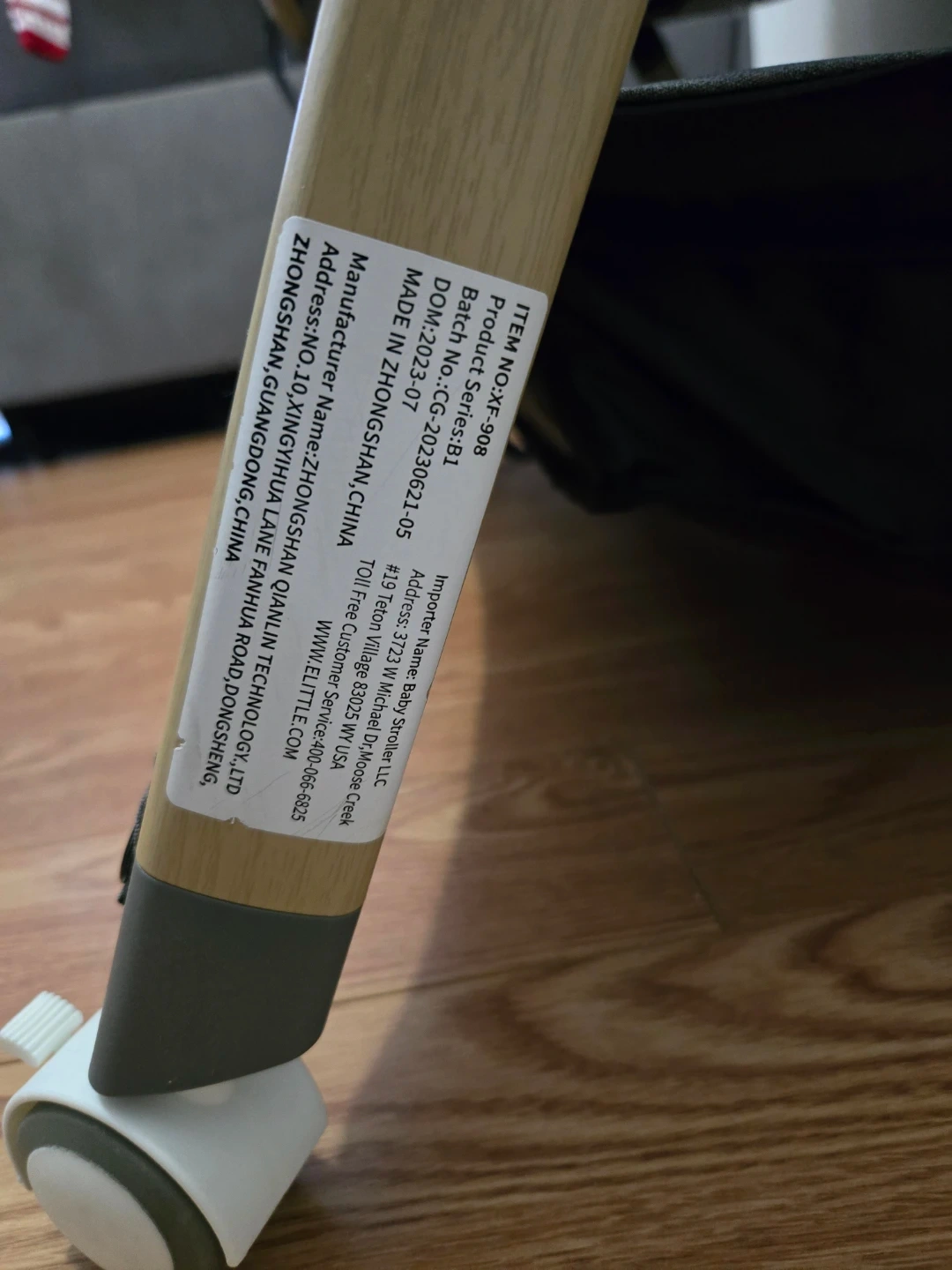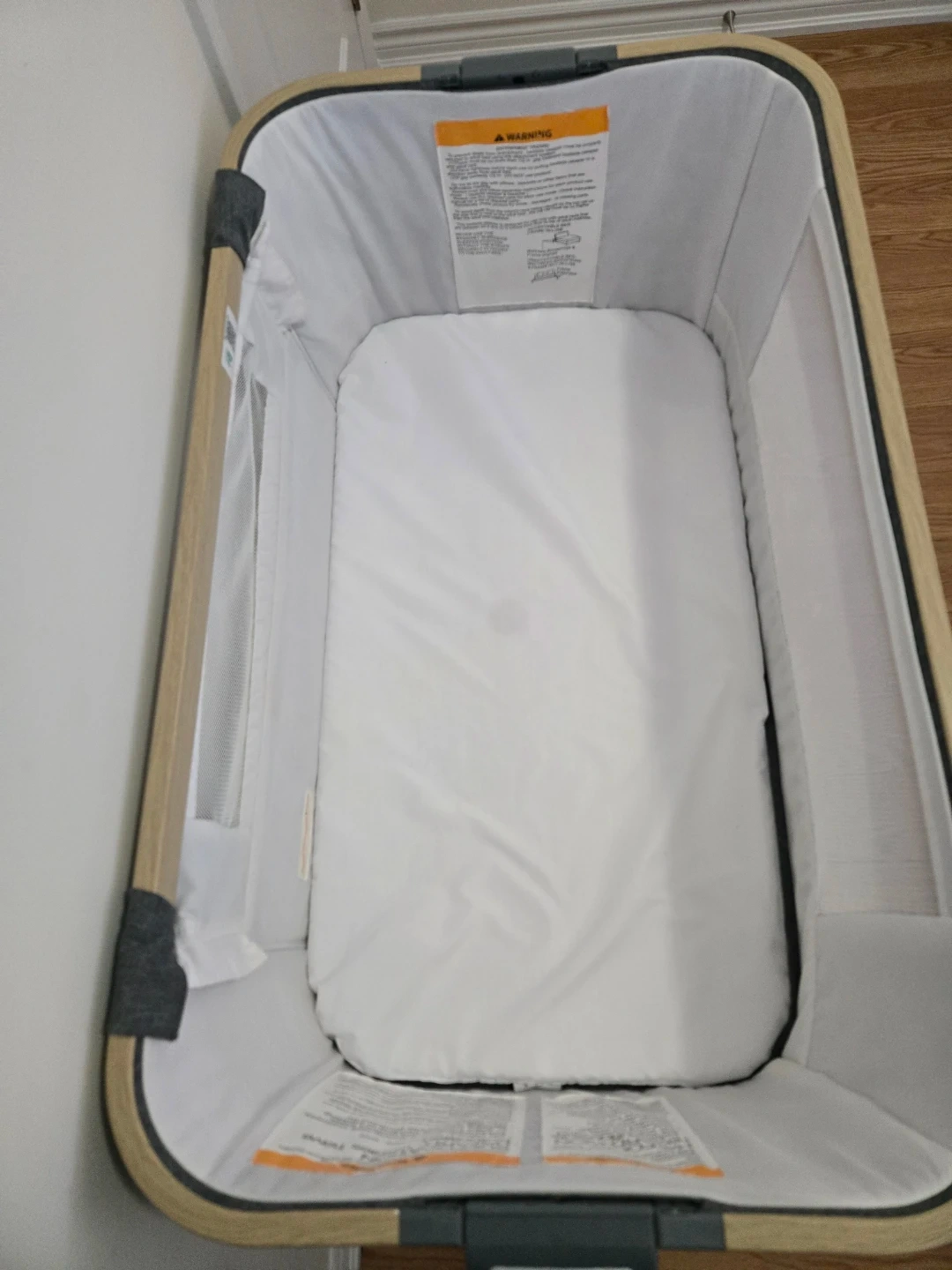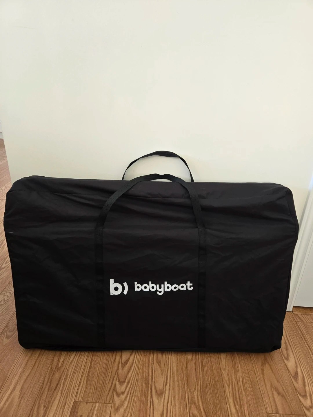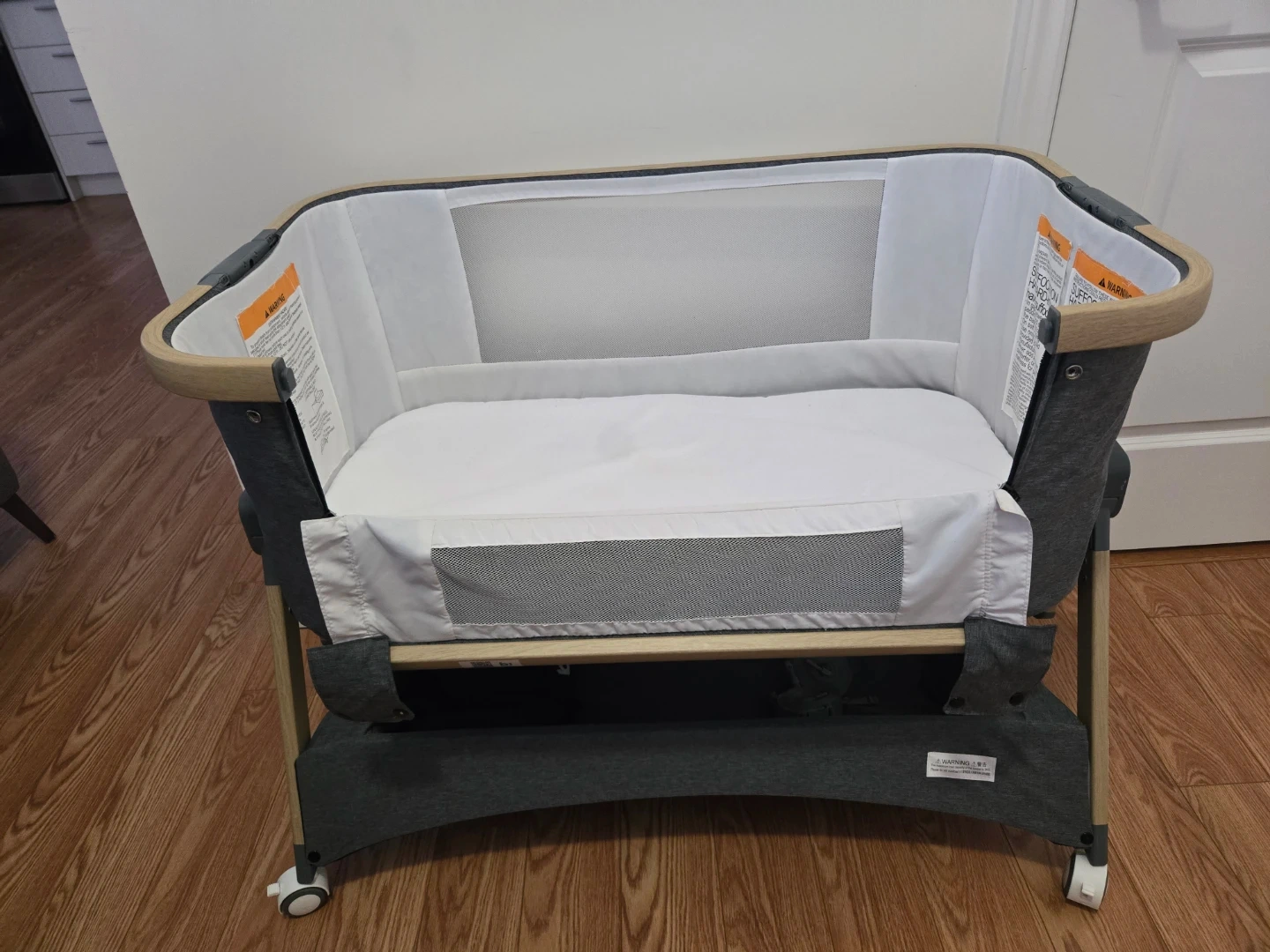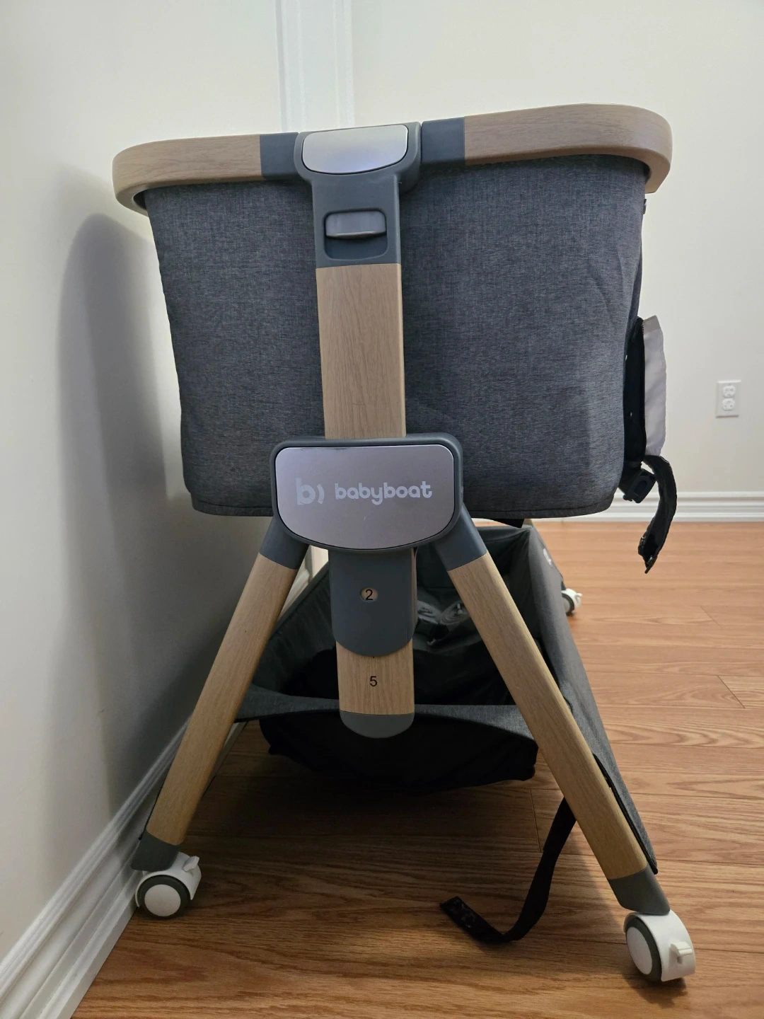 This is a Babyboat bedside bassinet with a grey fabric exterior and wooden accents. It features mesh sides for ventilation and a lower storage basket. It has wheels for easy mobility.