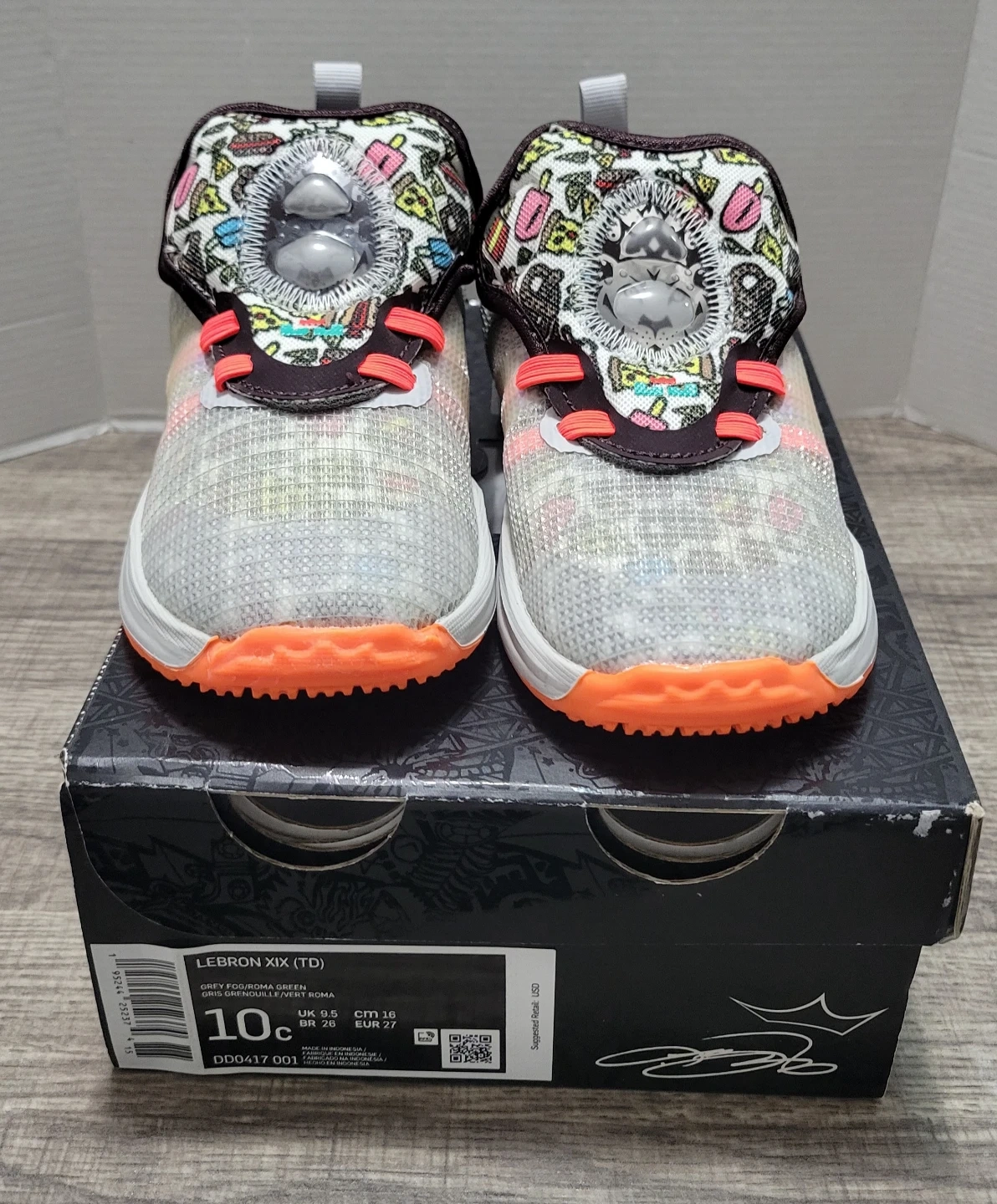Nike LeBron XIX TD toddler sneakers in "Grey Fog/Roma Green" colorway. Shoes are size 10c. Includes original box. These are perfect for active toddlers!