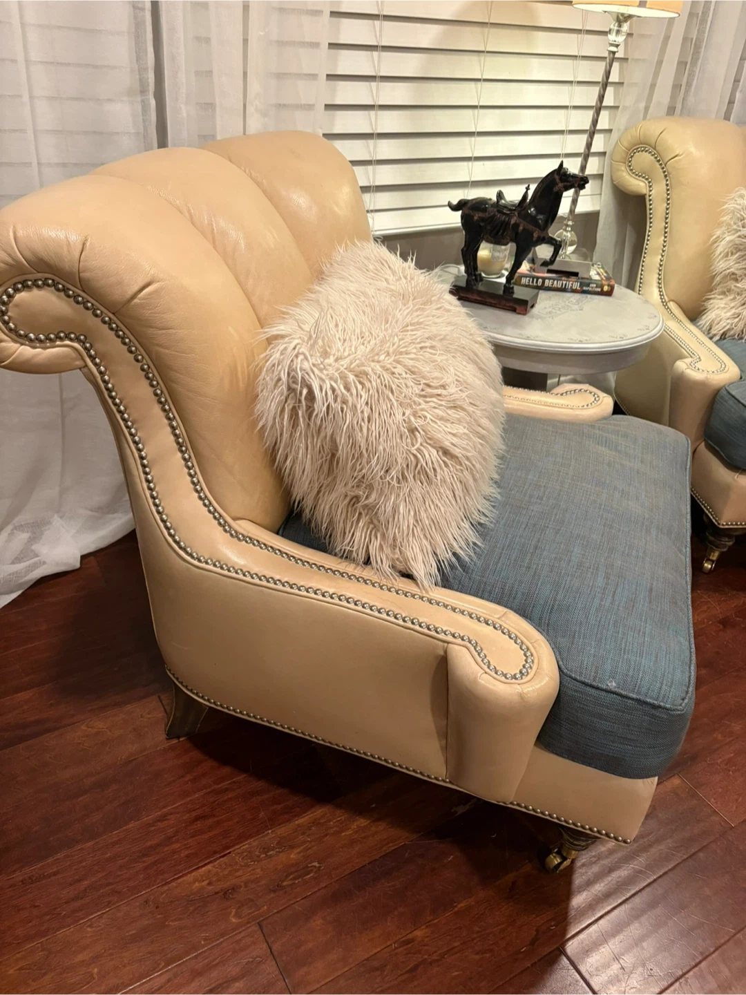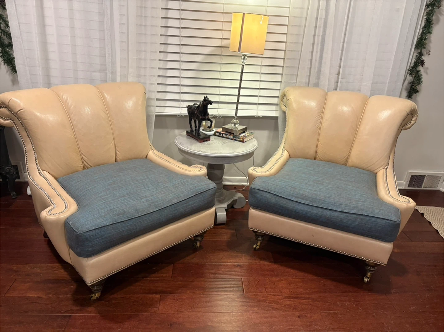 Beautiful like new custom genuine leather chairs with silver nailhead trim. Gorgeous and super comfortable with casters on front legs for ease of moving. Throw pillows not included. Nonsmoking home.