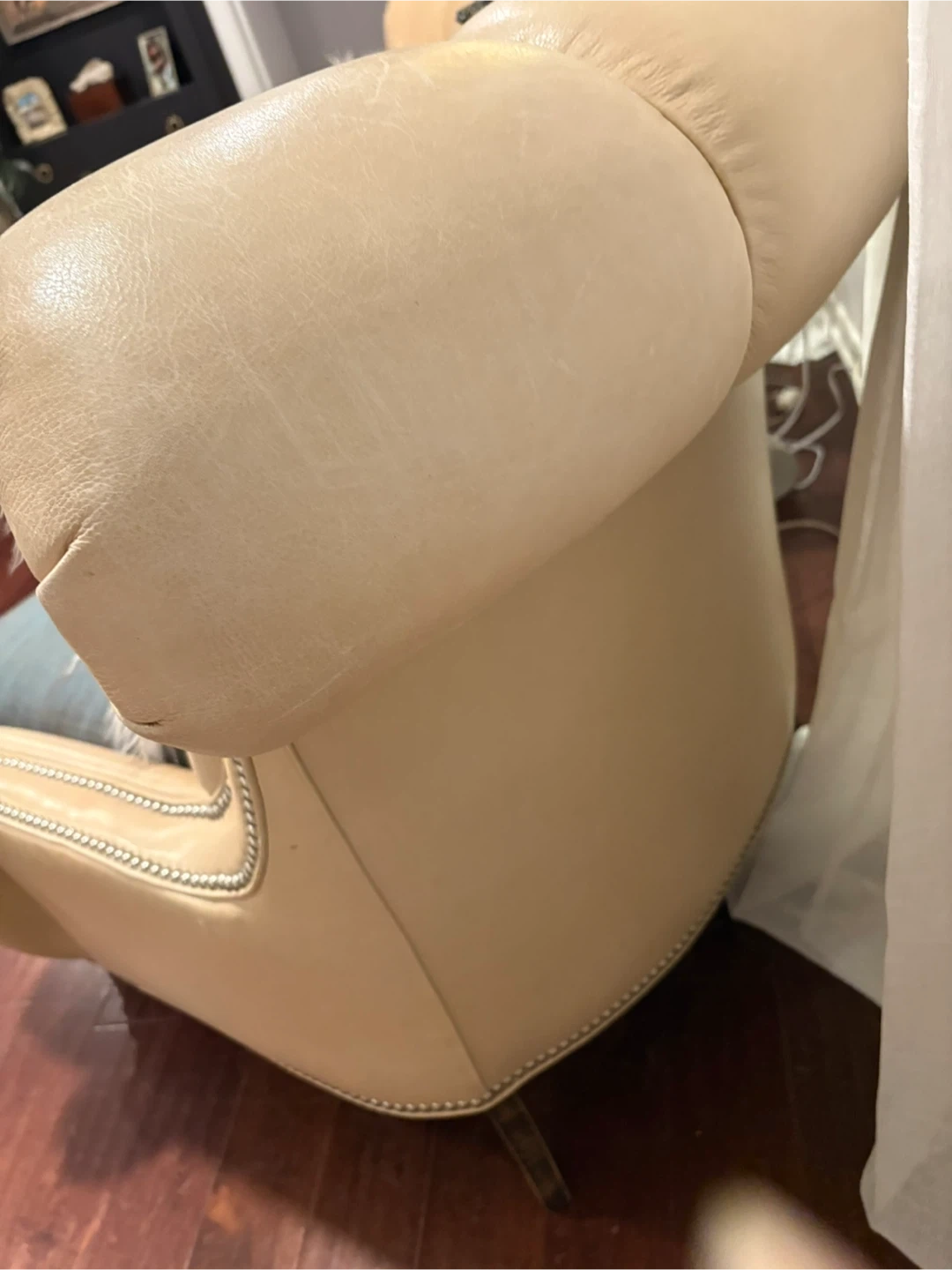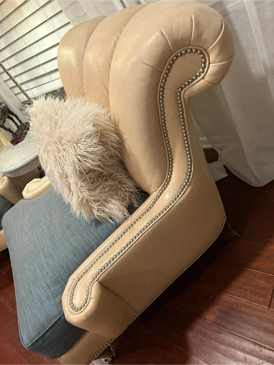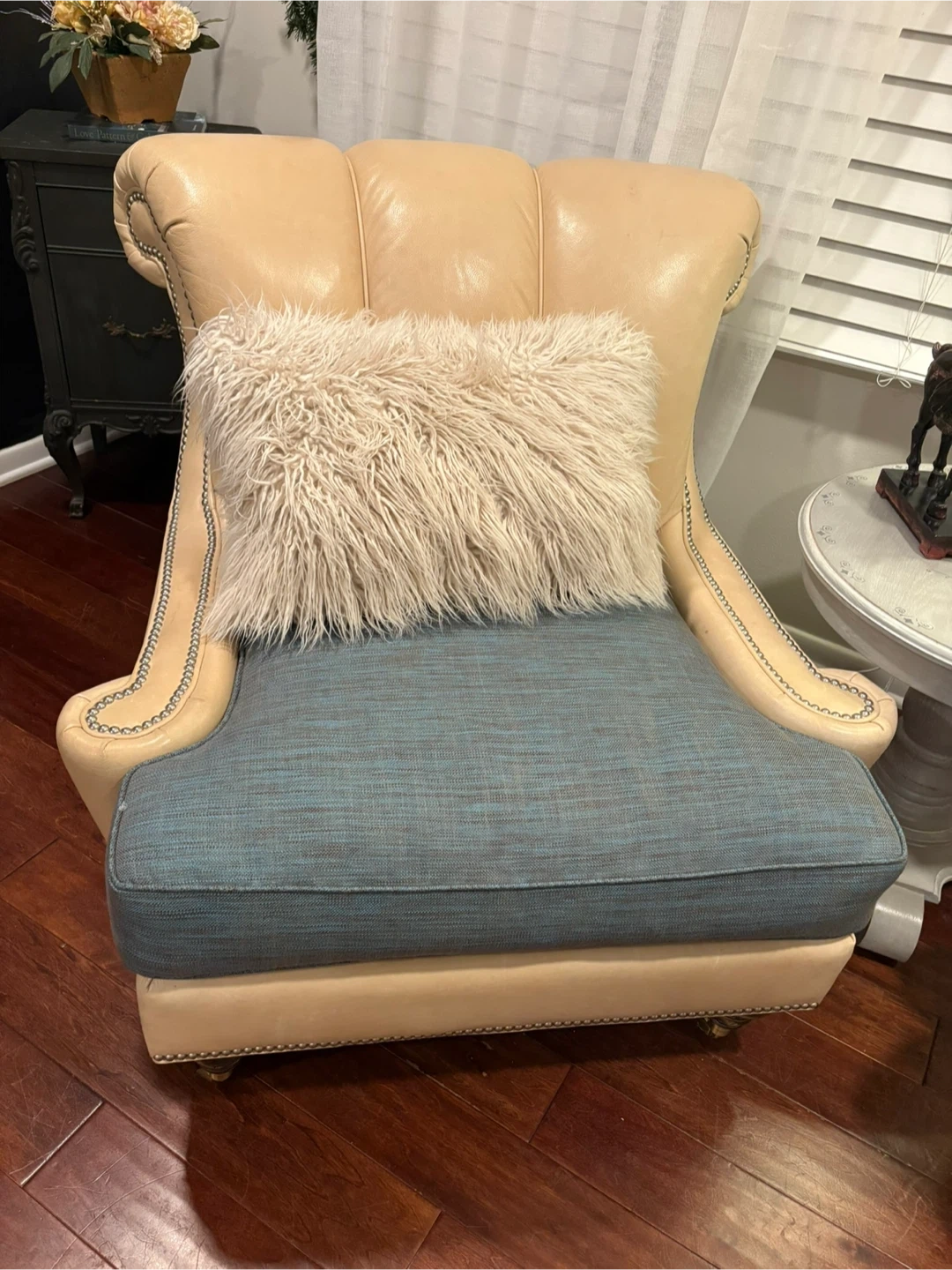 Beautiful like new custom genuine leather chairs with silver nailhead trim. Gorgeous and super comfortable with casters on front legs for ease of moving. Throw pillows not included. Nonsmoking home.