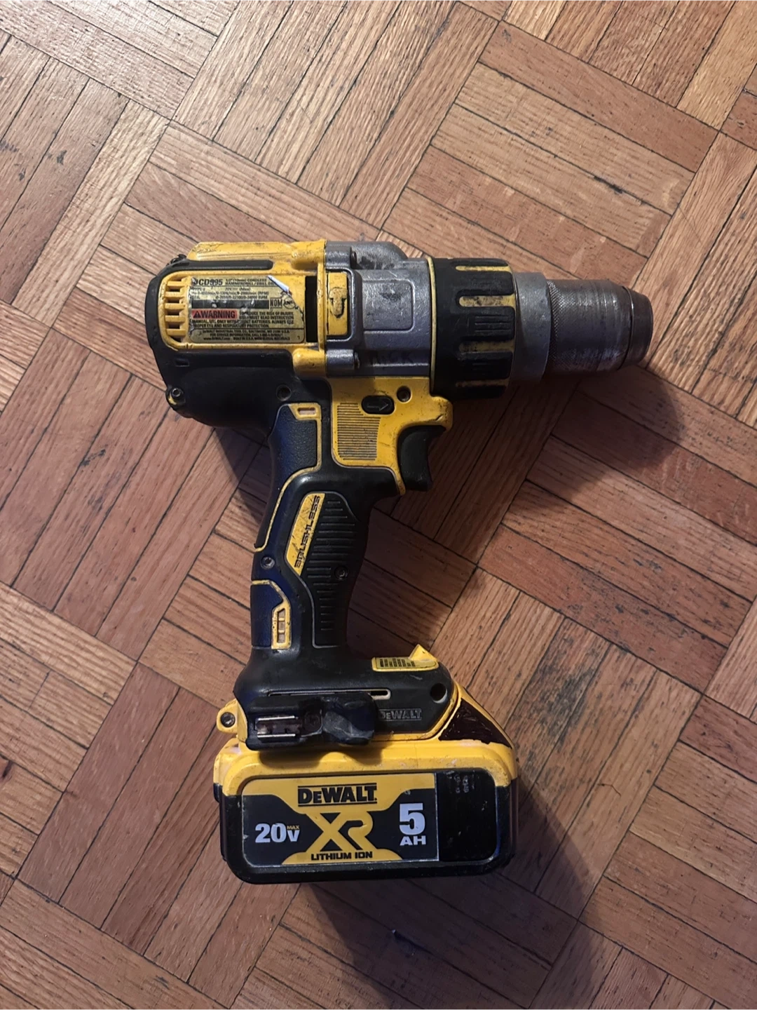 DeWalt 20V MAX XR cordless drill with a 5 Ah lithium ion battery. It's a brushed hammer drill with a brushless motor. Includes a metal chuck for secure bit grip.