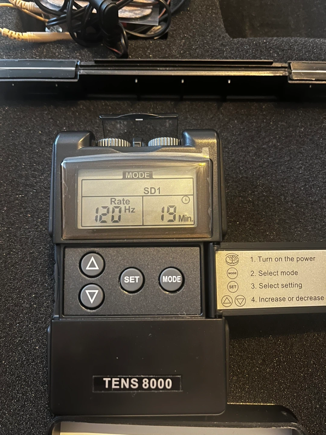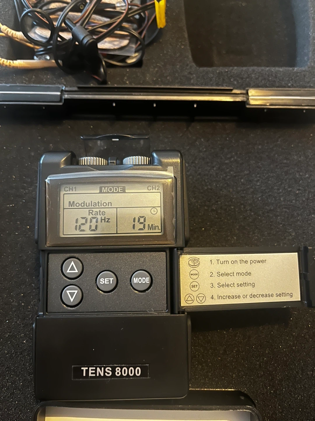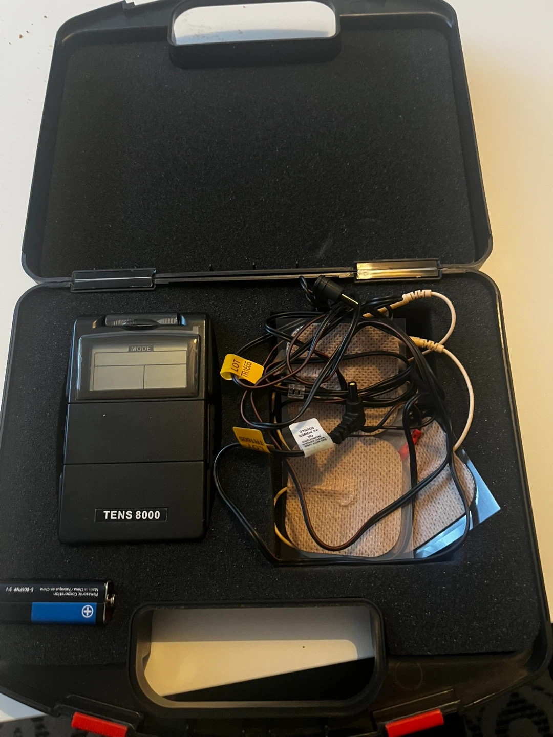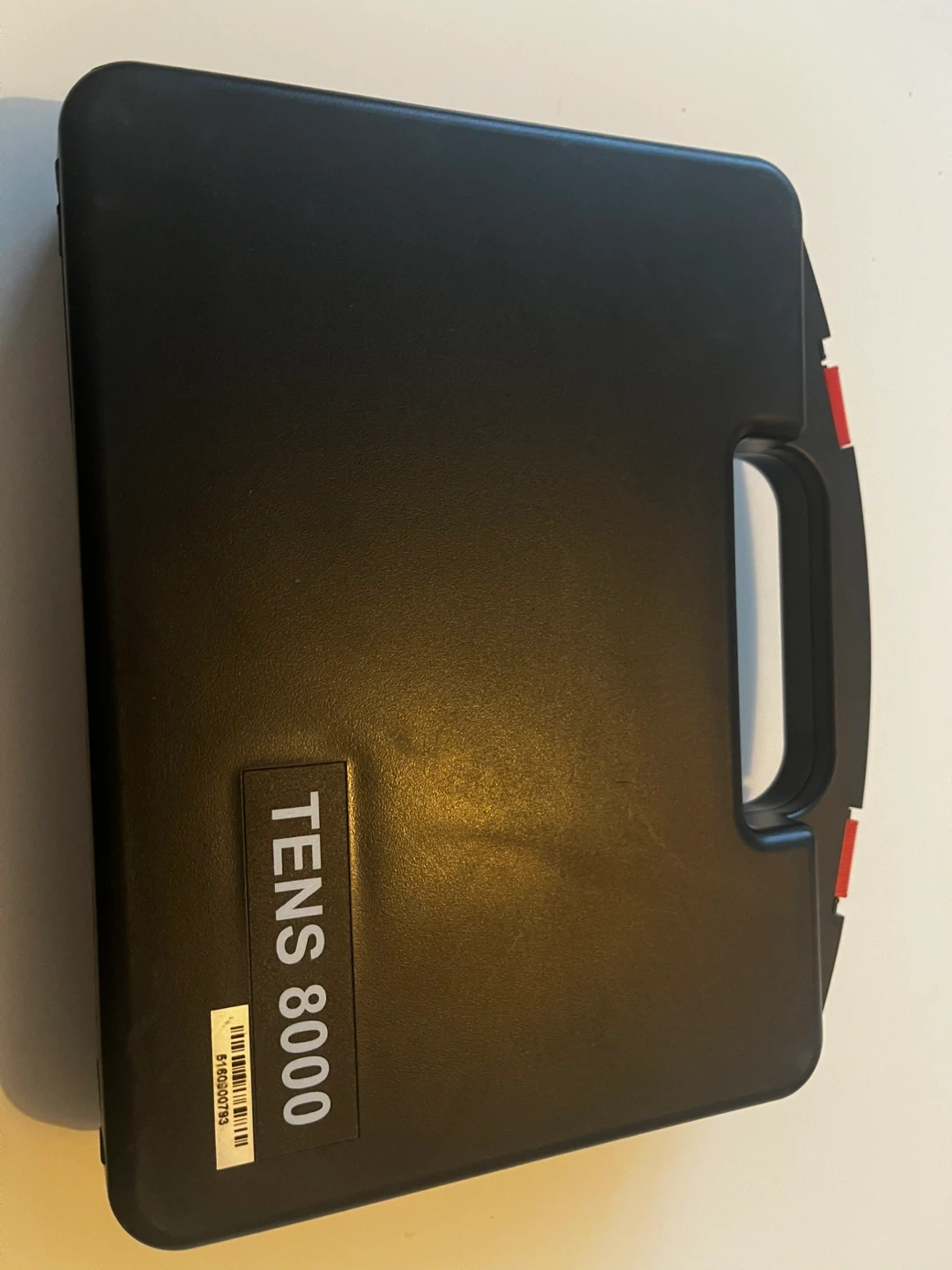 This TENS 8000 unit comes with its original carrying case, wires, and pads. It's designed for personal pain relief. The unit has multiple modes and settings that can be adjusted.