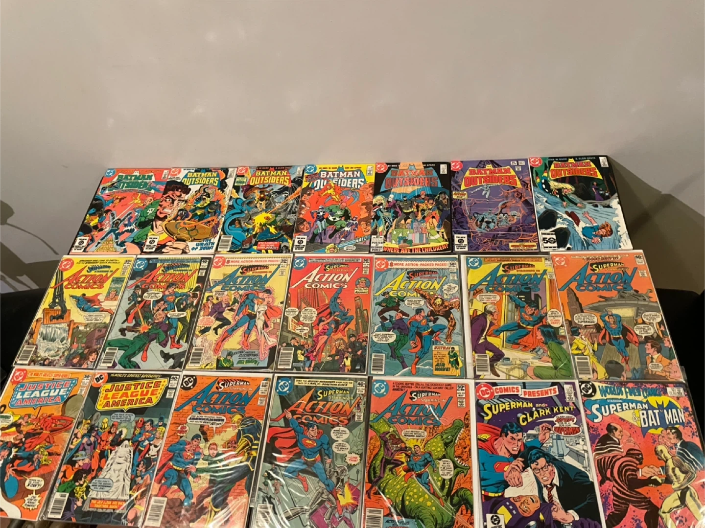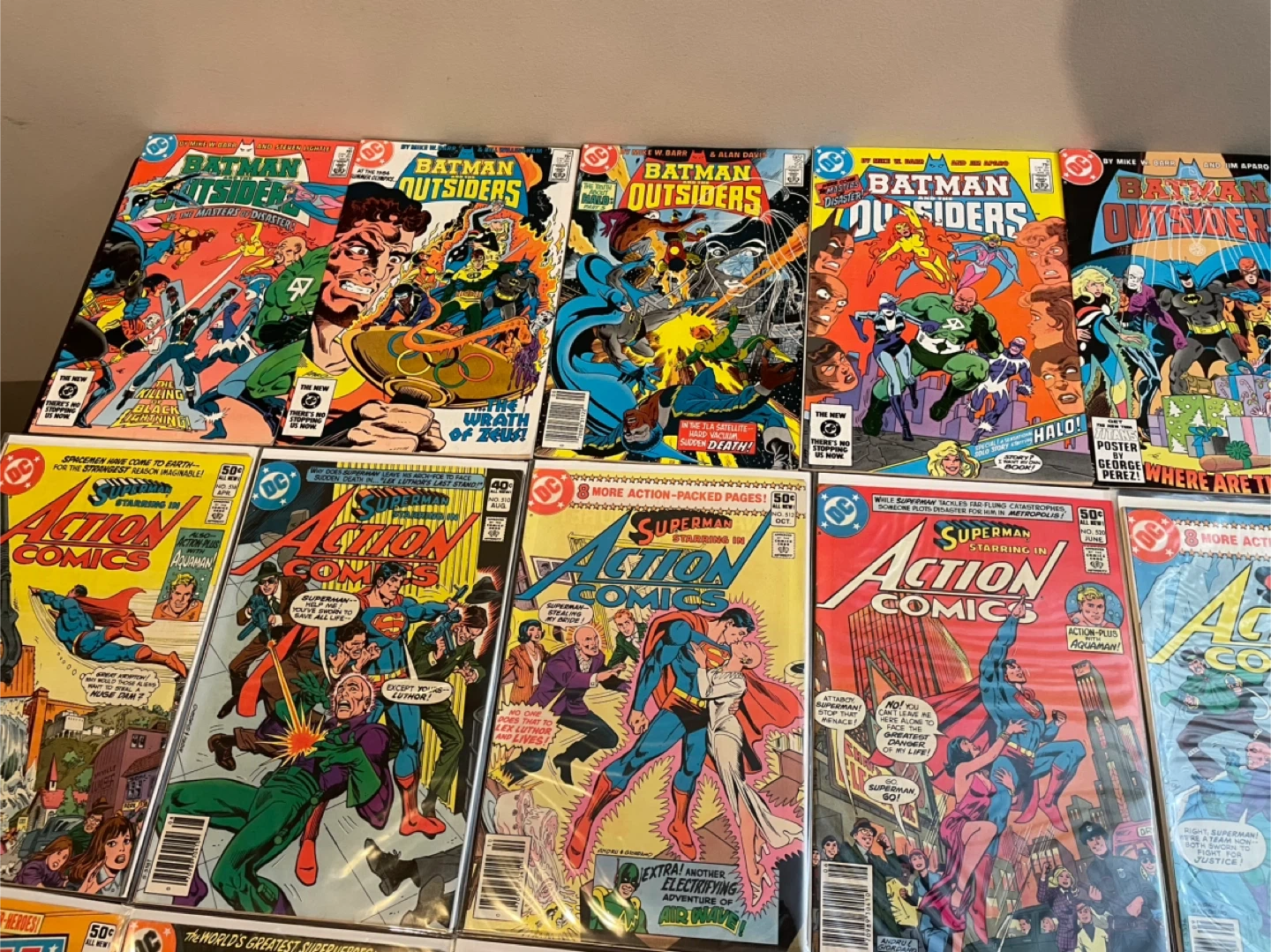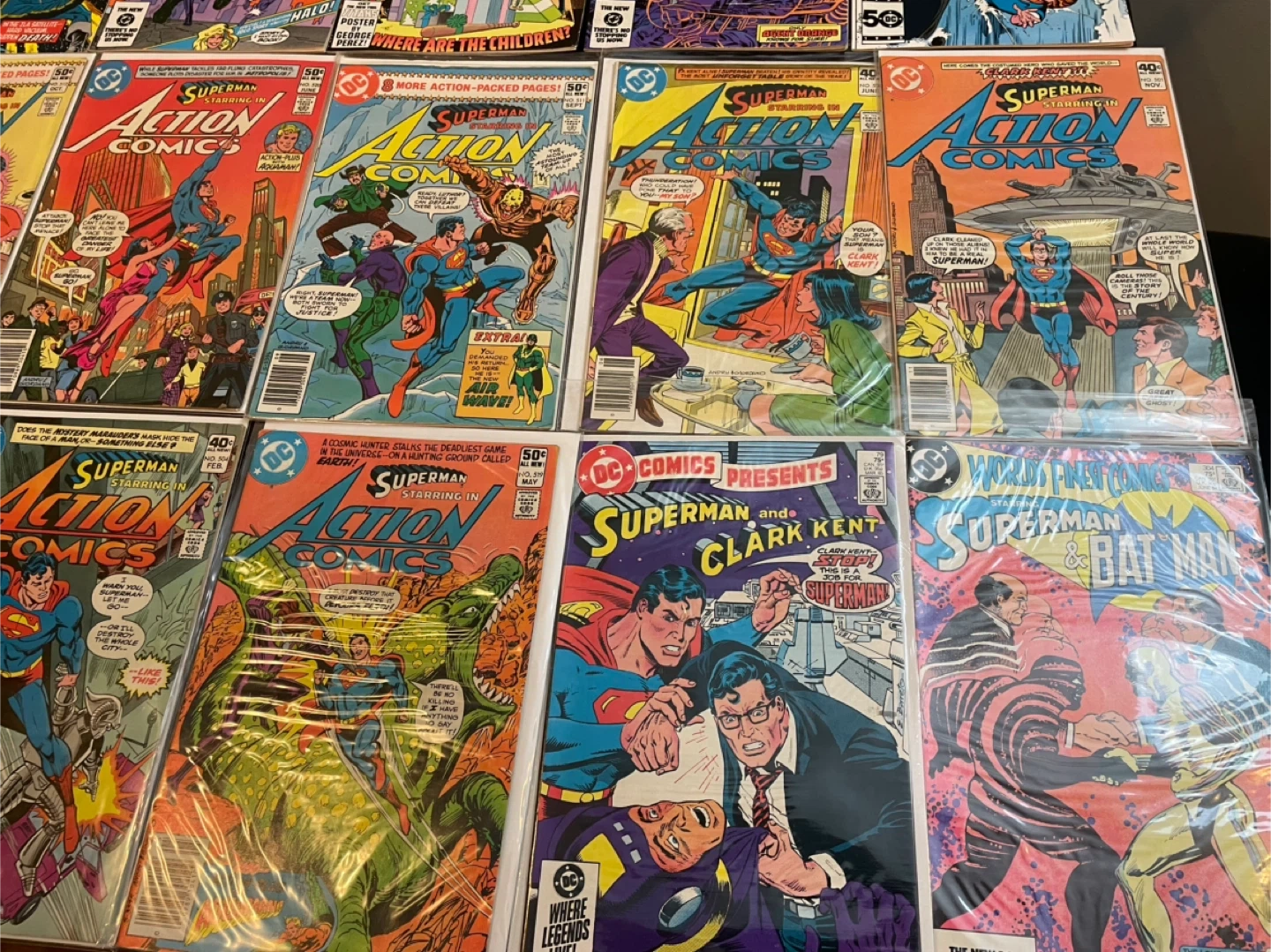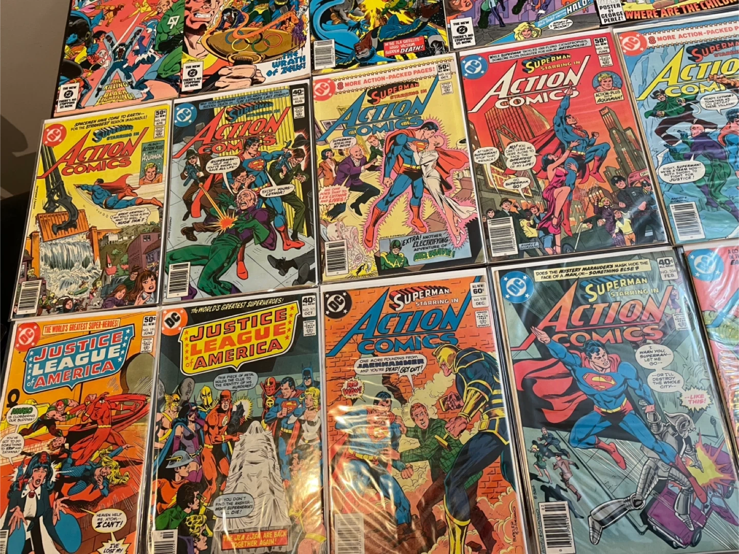 This collection includes various issues of DC Comics titles, featuring Batman and Superman. Many are bagged for protection. Great for any comic collector! 50$