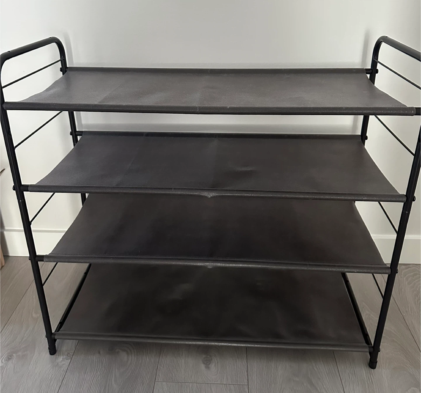This is a 4-tier shoe rack. It's made of metal and fabric shelves. It's great for organizing footwear and other items.