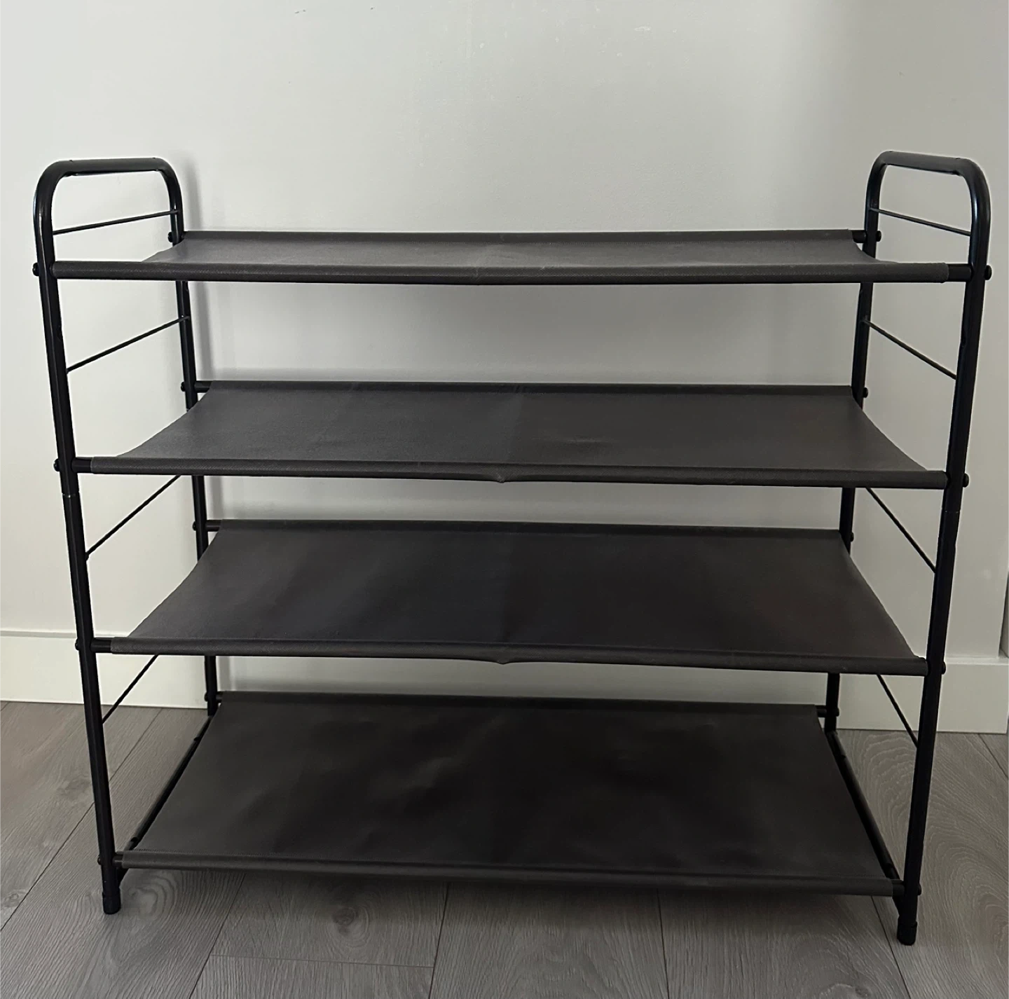 This is a 4-tier shoe rack. It's made of metal and fabric shelves. It's great for organizing footwear and other items.