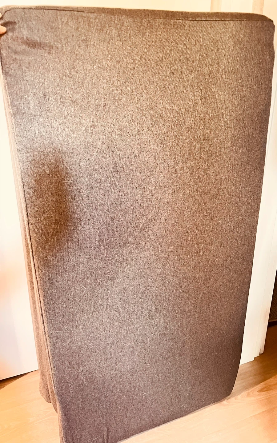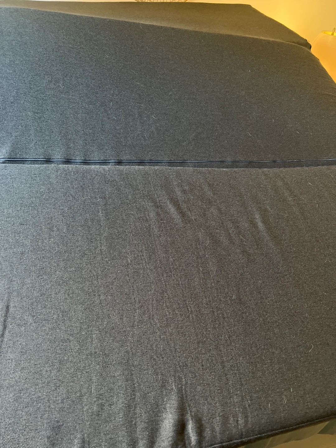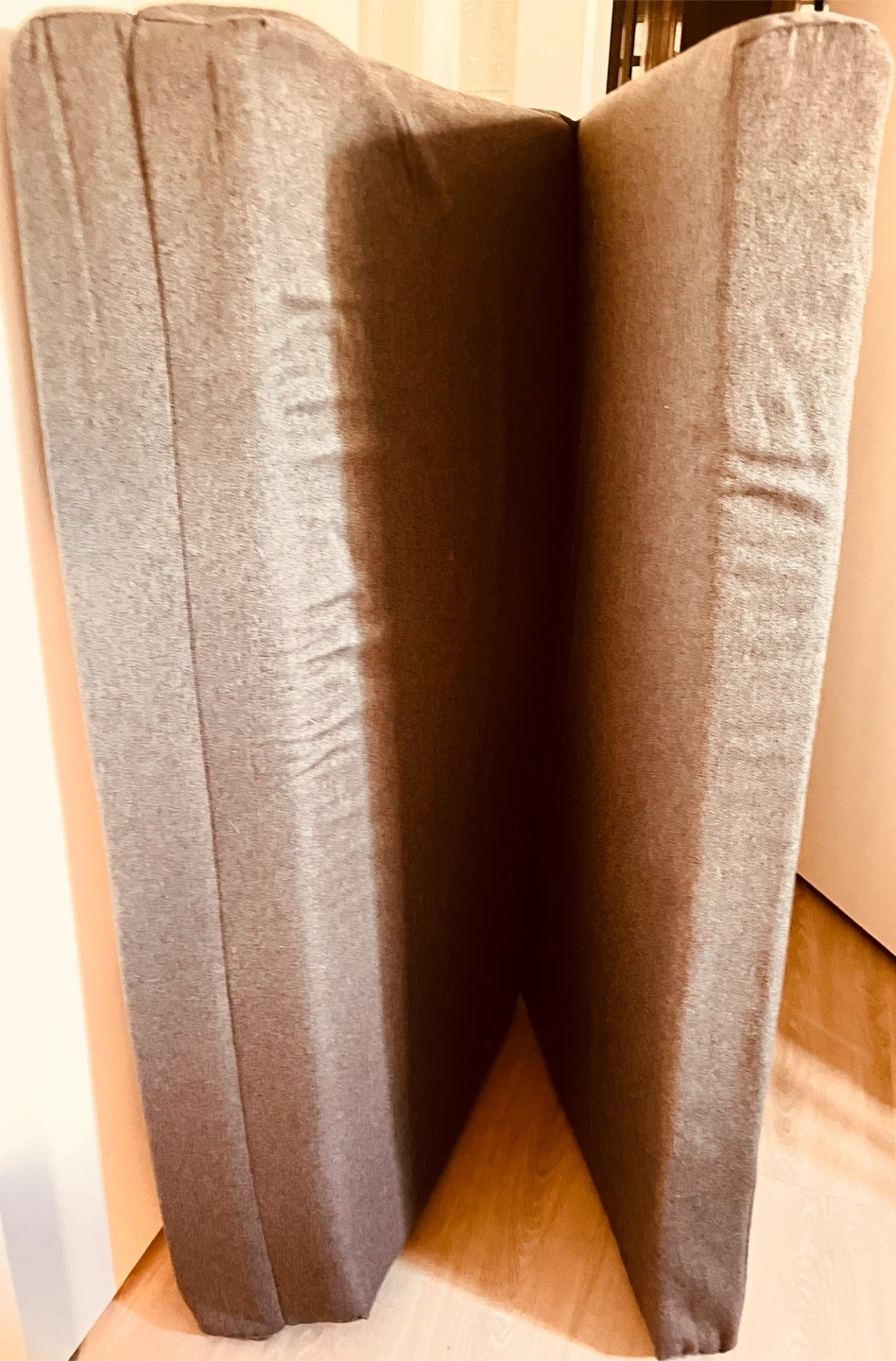 This is a foldable mattress topper. It's made of a grey fabric material. It can be folded for easy storage or transport. Great for camper vans and road travelling.