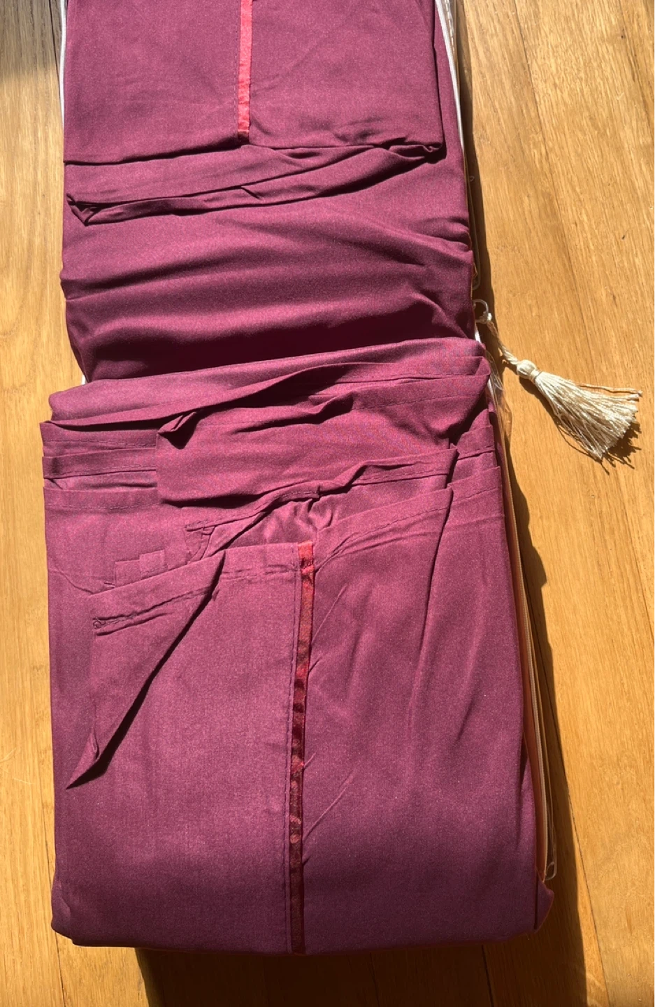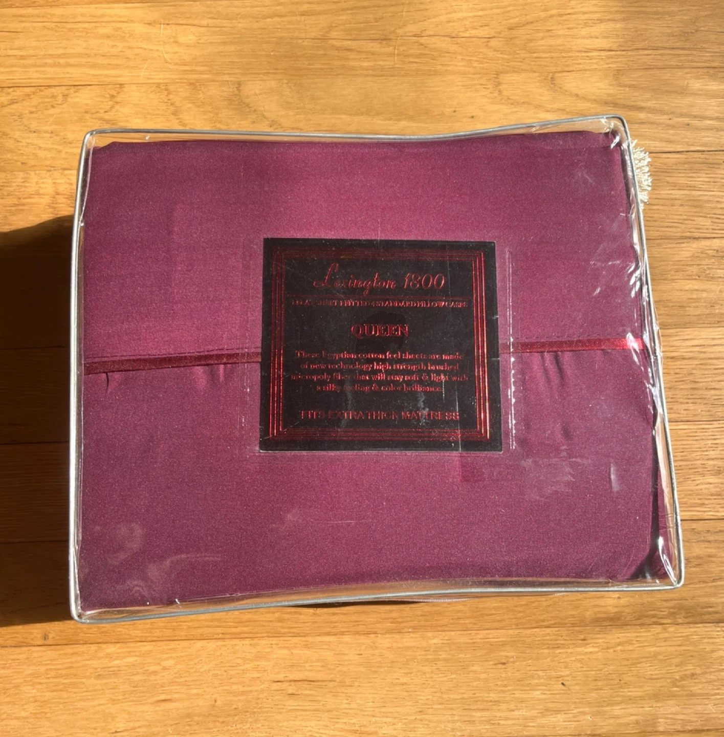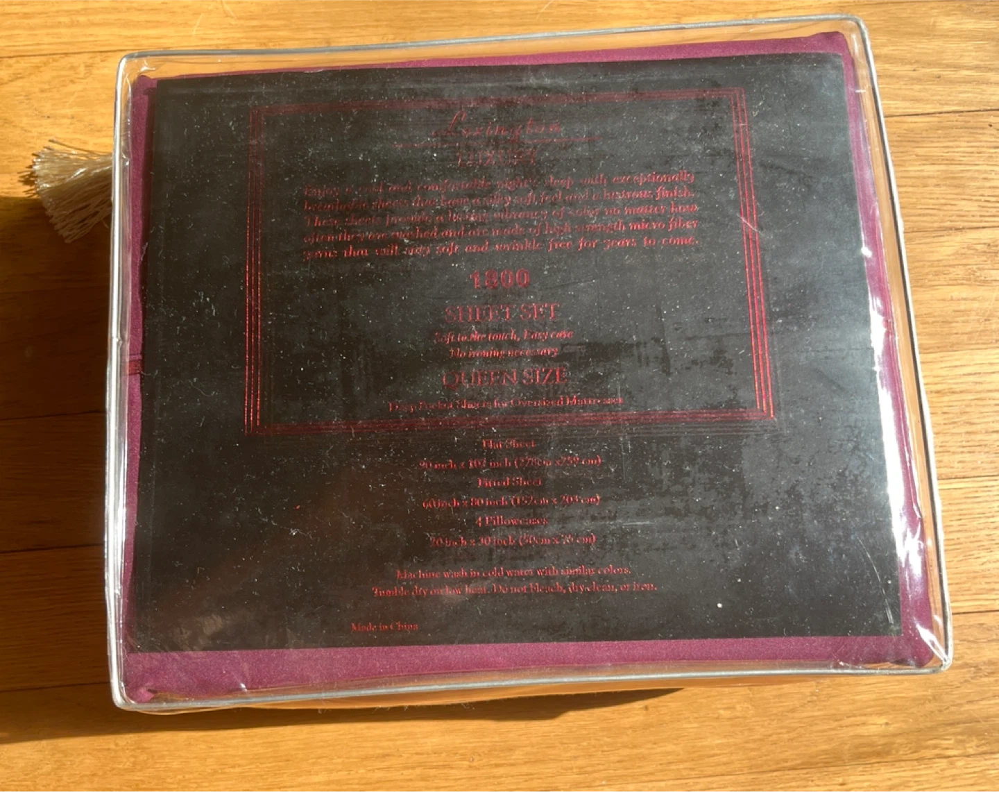 This is a queen size sheet set from Lexington in burgundy. It's made from 1800 thread count microfiber. The set includes a fitted sheet, flat sheet 90 x 102 inch ( 228 x 259 cm) , and 4 pillowcases 20 x 30 ( 50 x 75 cm) . Machine washable for easy care!