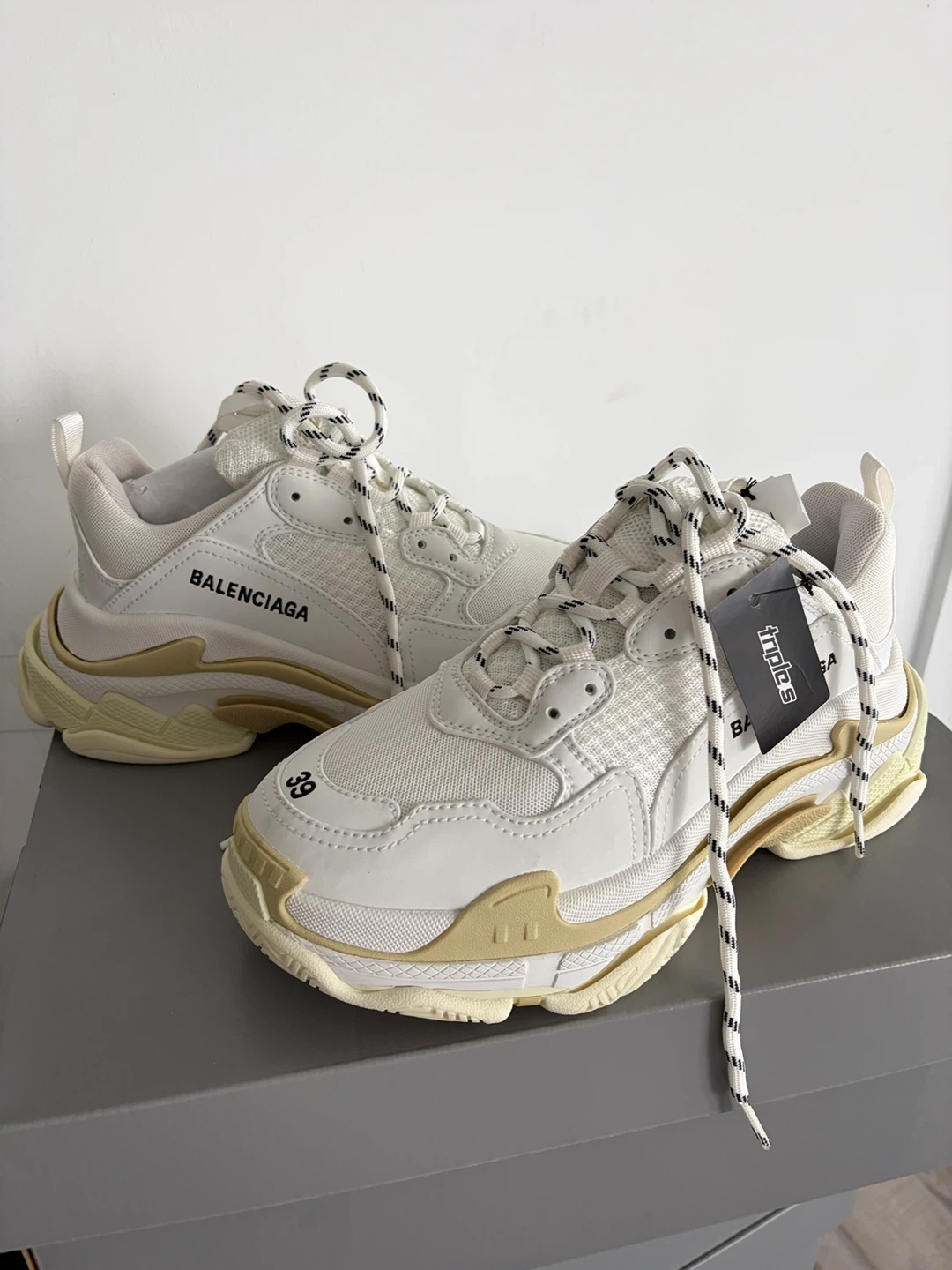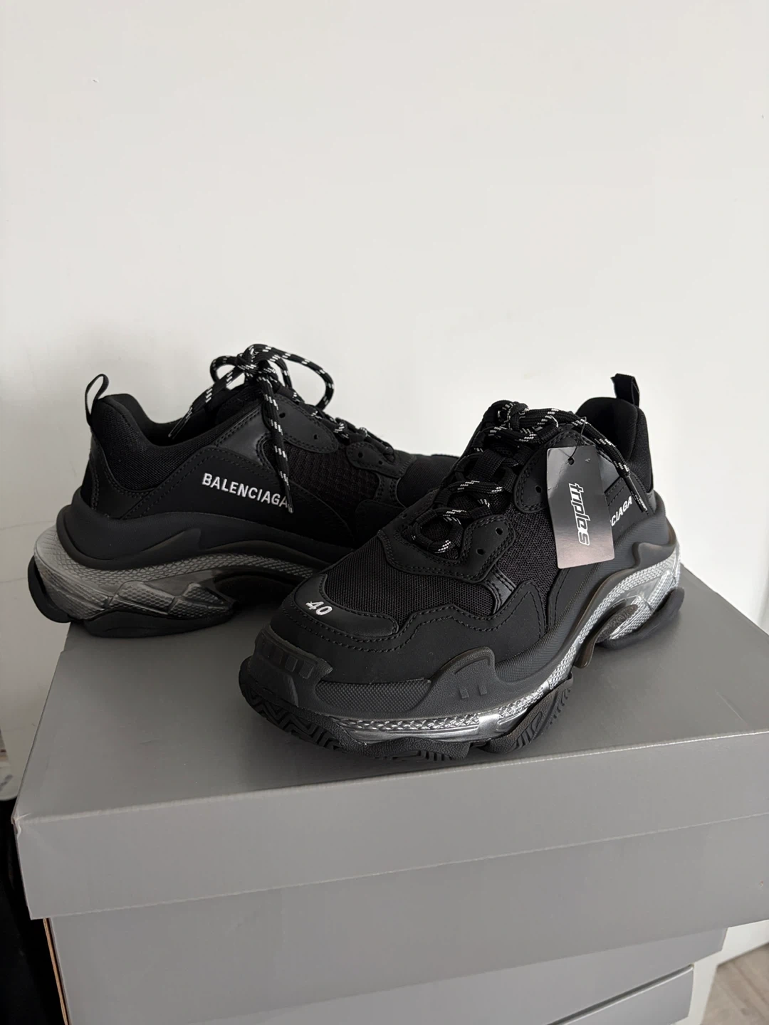 Balenciaga Triple S sneakers in black. These kicks feature a chunky sole and mixed material upper. Includes original box.