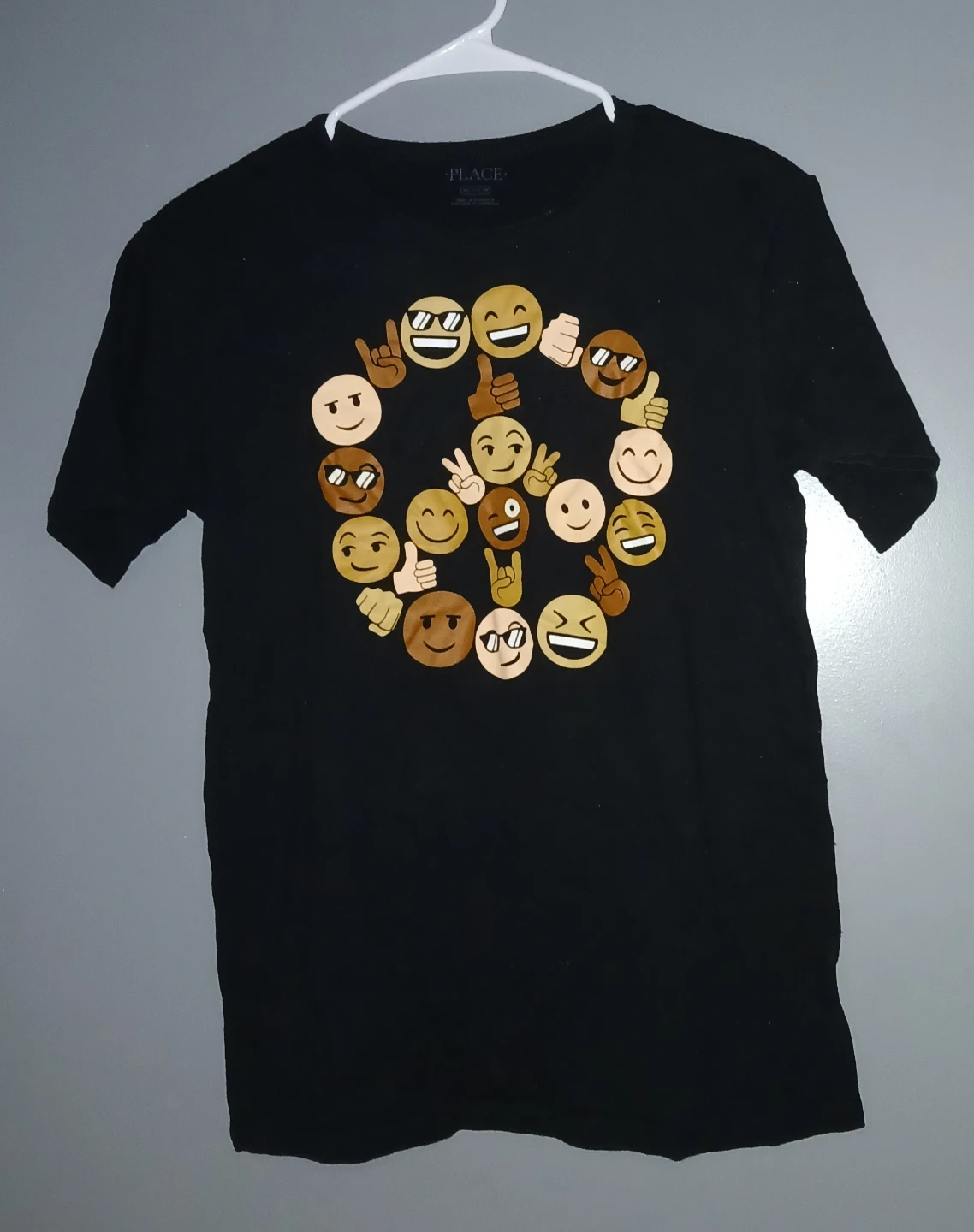 A black T-shirt from The Children's Place featuring a fun emoji design! This tee is perfect for everyday wear and is sure to bring a smile to anyone's face. It's in great condition and ready for a new adventure.