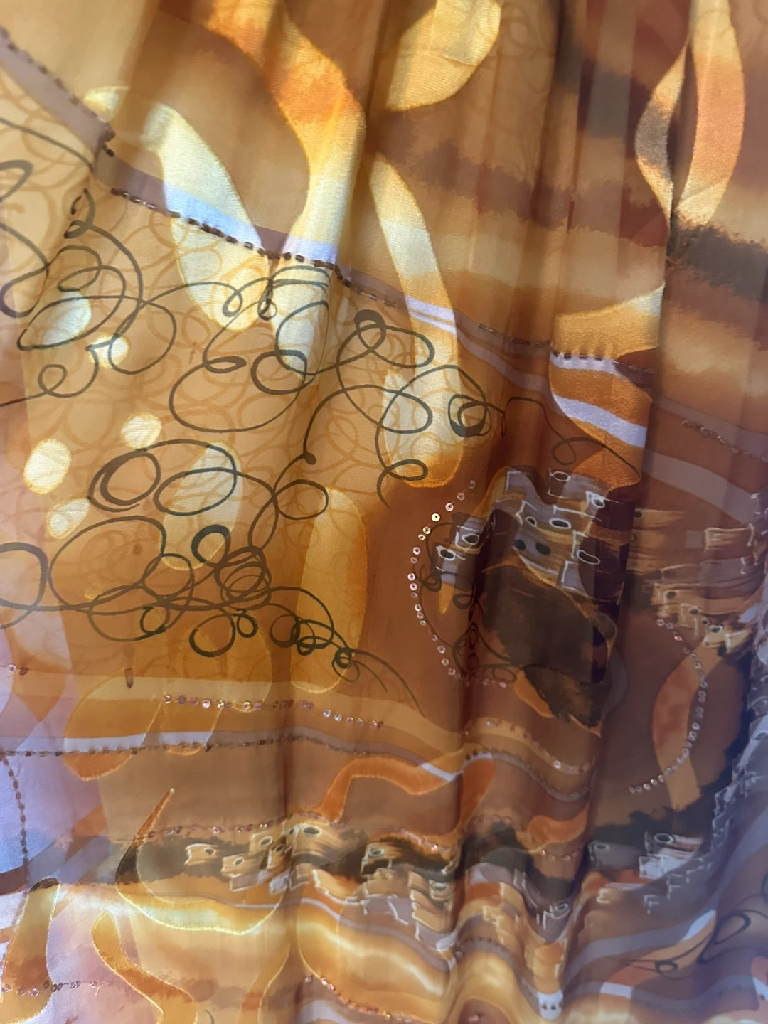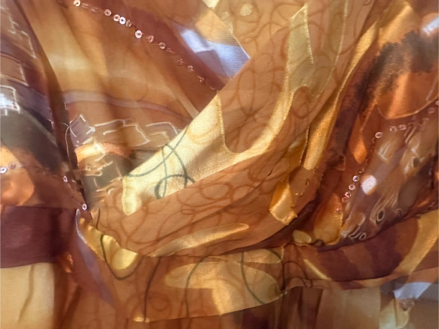 Sheer brown maxi dress with a multicoloured abstract floral print. Features adjustable spaghetti straps and a draped neckline. Made from a lightweight, flowy fabric wth sequin .