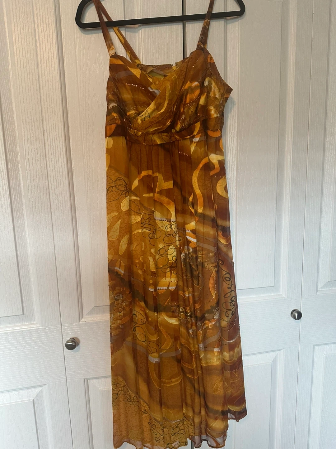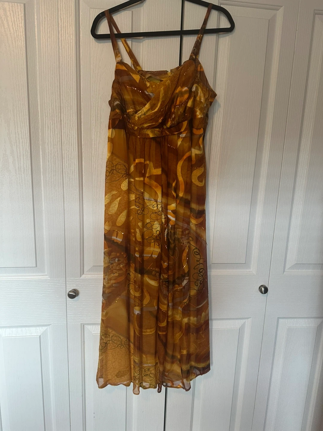 Sheer brown maxi dress with a multicoloured abstract floral print. Features adjustable spaghetti straps and a draped neckline. Made from a lightweight, flowy fabric wth sequin .