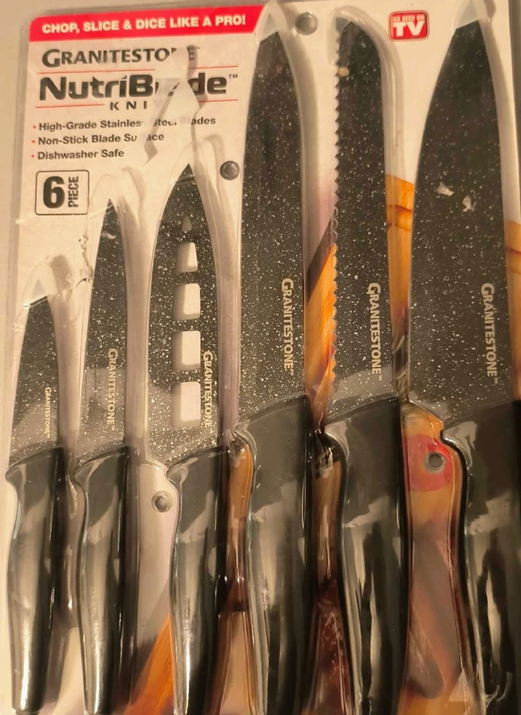 This Granitestone 6-piece knife set features high-grade stainless steel blades. They're non-stick and dishwasher safe. A great set for chopping, slicing, and dicing!