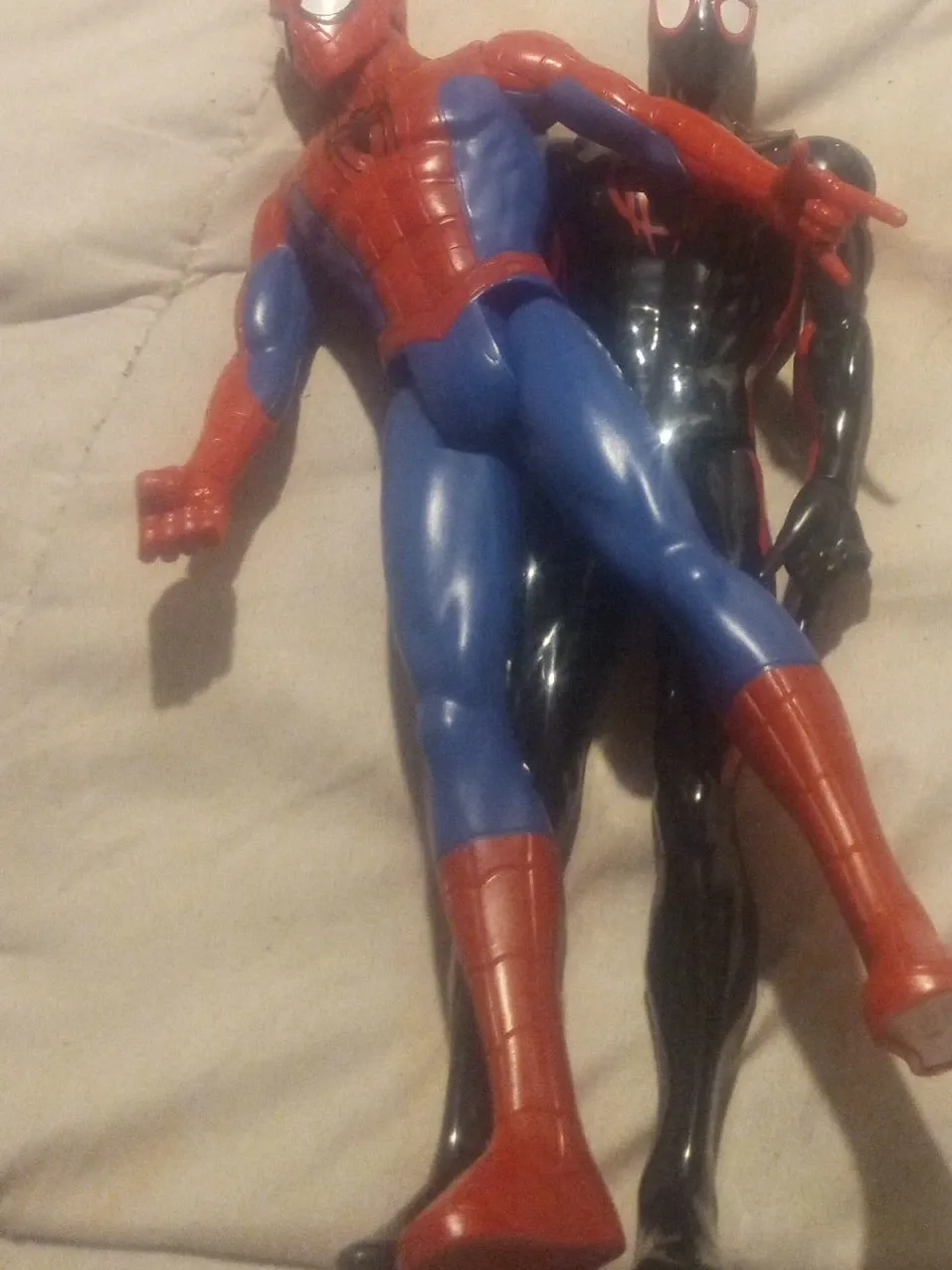 This listing includes two action figures: Spider-Man in his classic red and blue suit and Miles Morales in a black suit. These figures are made of plastic and are ready for play. They're great for any Marvel fan!