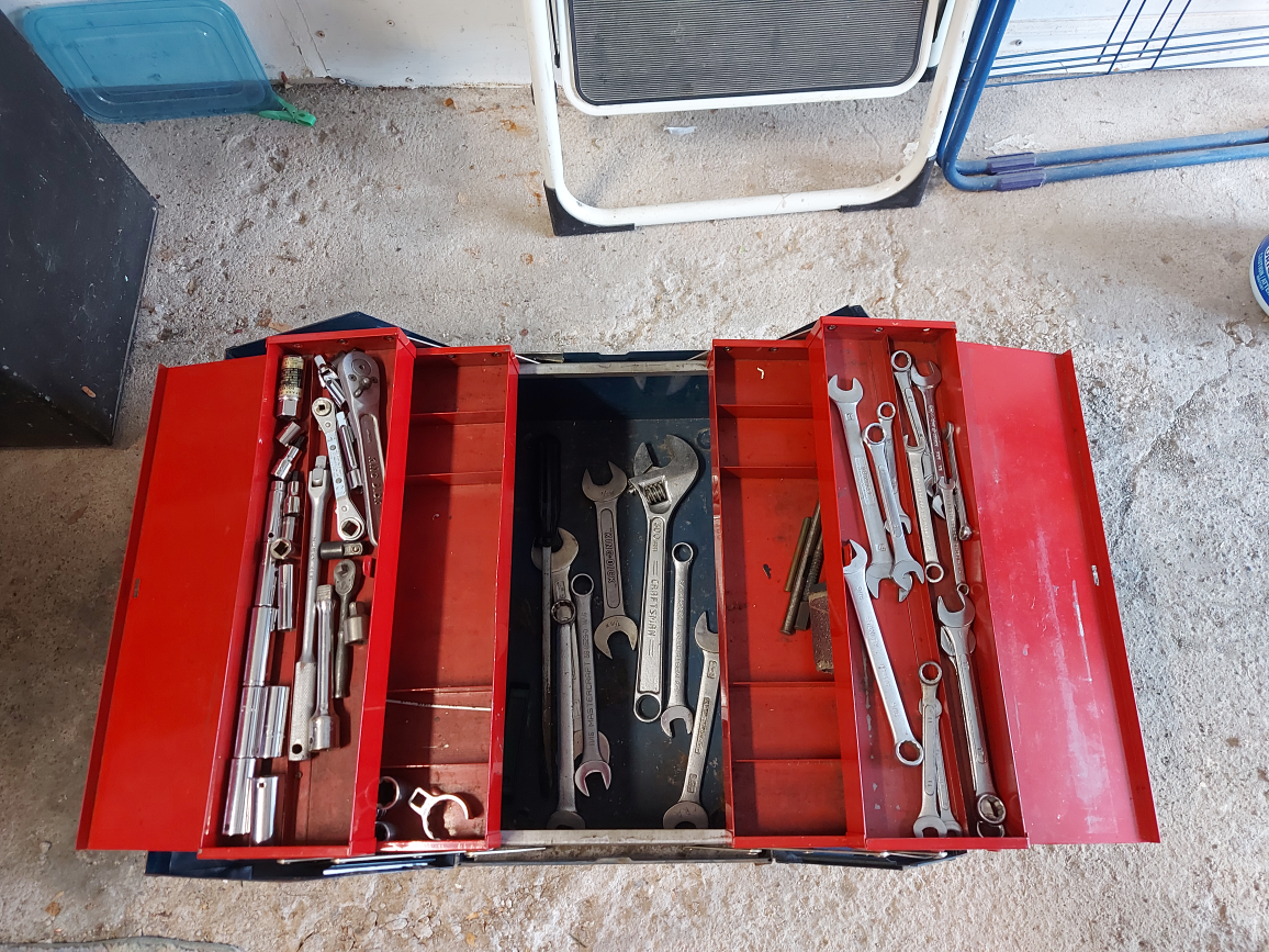 Metal toolbox with cantilever design that opens up to reveal multiple compartments. Selling as a set (all tools included). Cash pickup, Lakeport and Linwell roads.