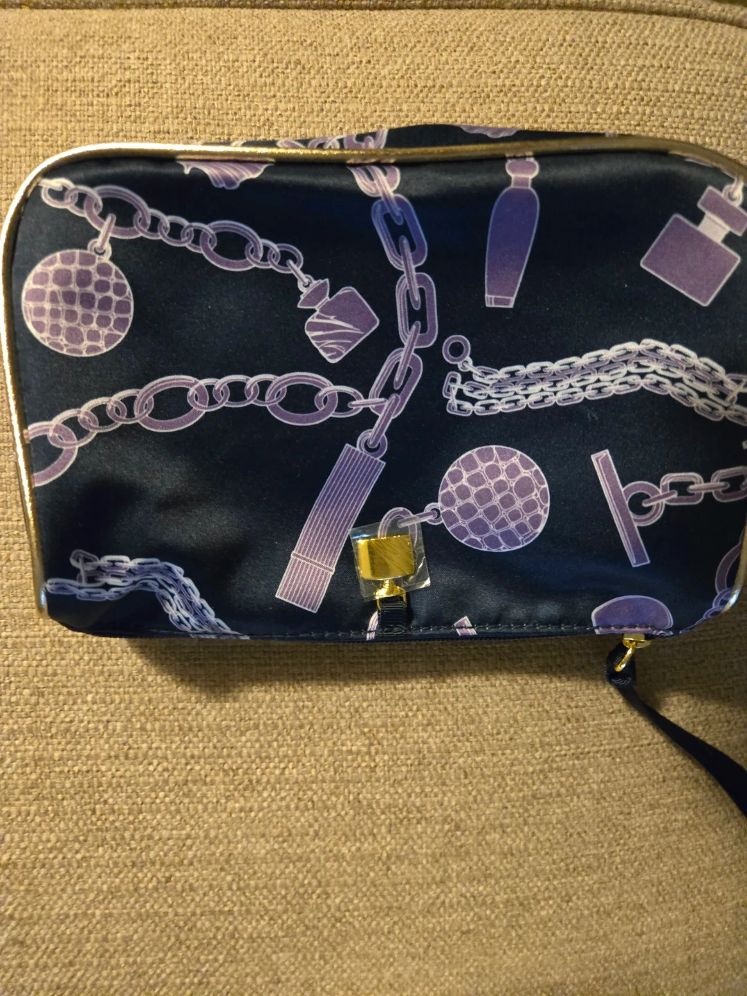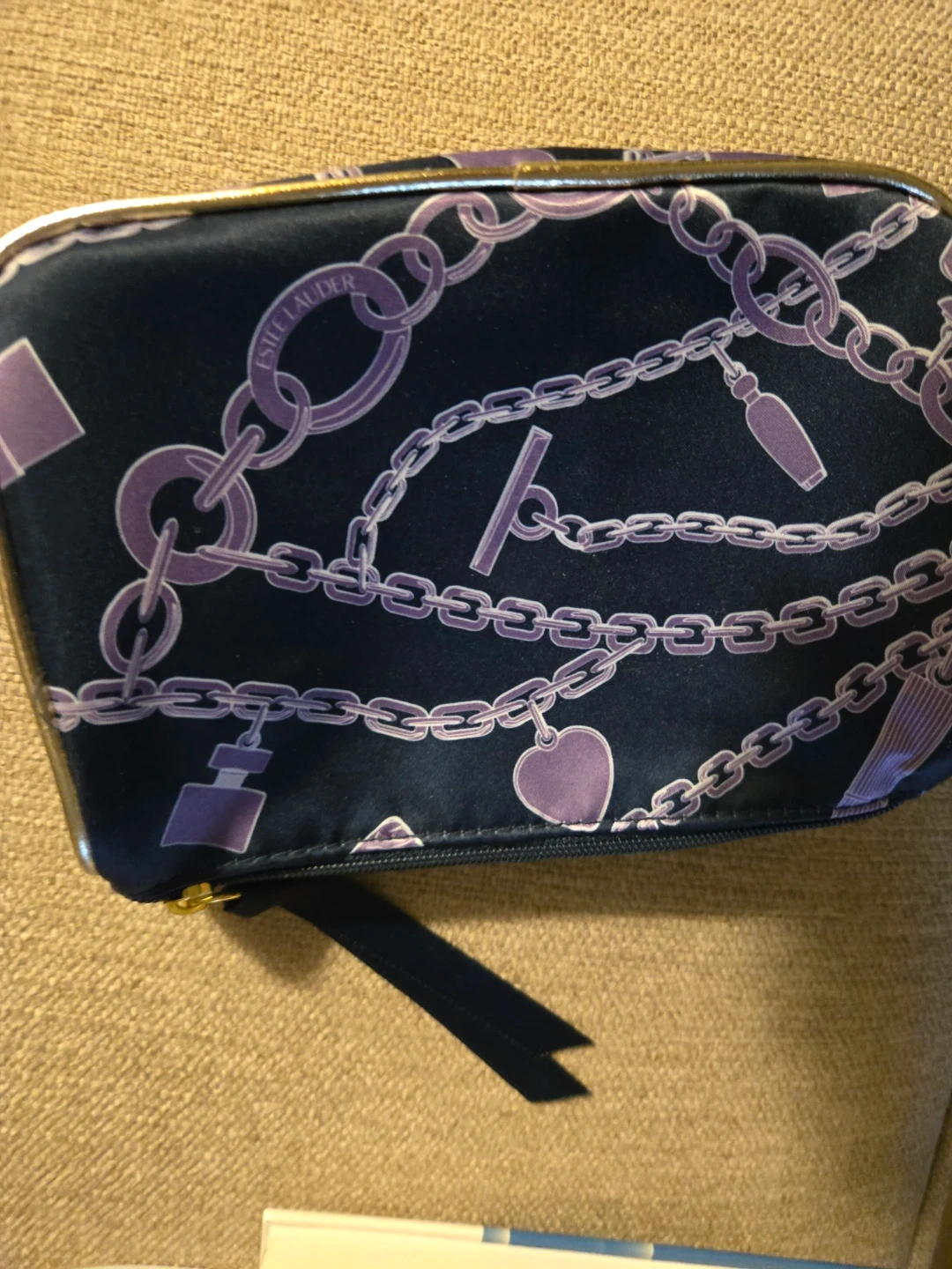 Dark blue cosmetic bag with a purple chain and charm pattern. Features a gold-tone clasp and zipper closure. Made by Estée Lauder. Includes trial size mascara.