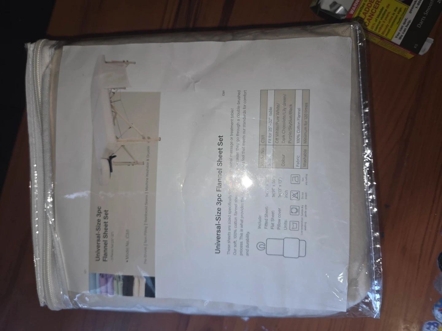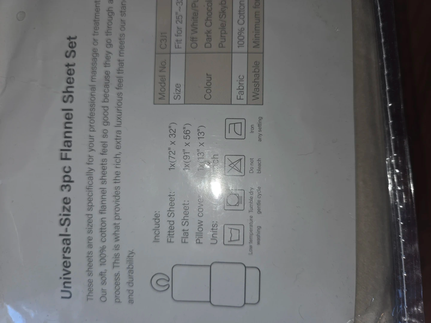 This is a 3-piece flannel sheet set designed for professional massage or treatment tables. It's made of 100% cotton flannel for a soft feel. The set includes a fitted sheet (1x 72"x 32"), a flat sheet (1x 91"x 56"), and a pillow cover (1x 13"x 13").
