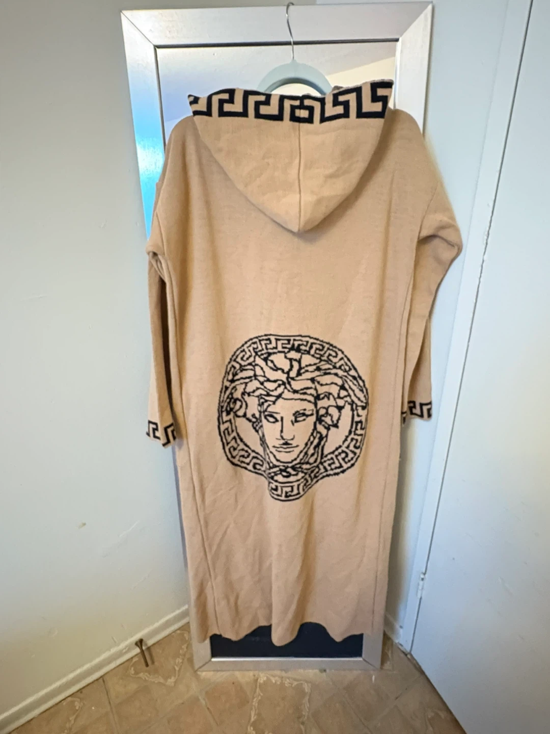 This stylish beige knit set features the iconic Versace Greek key pattern and Medusa head logo. It includes a long robe with a hood and matching pants. Made from a comfortable knit material.
