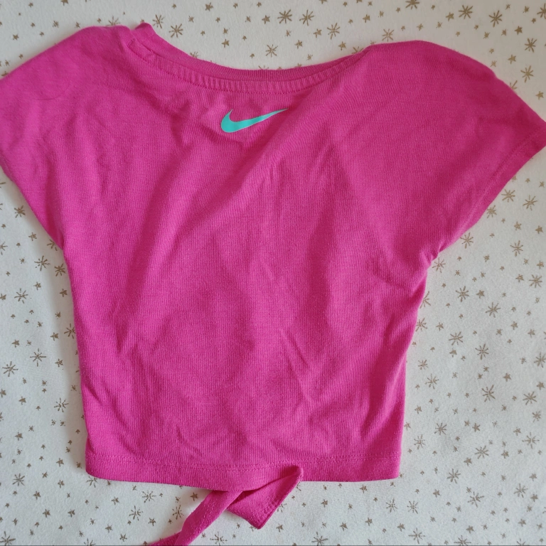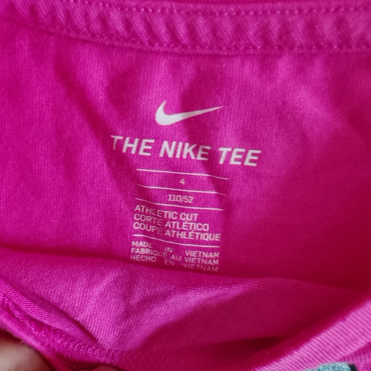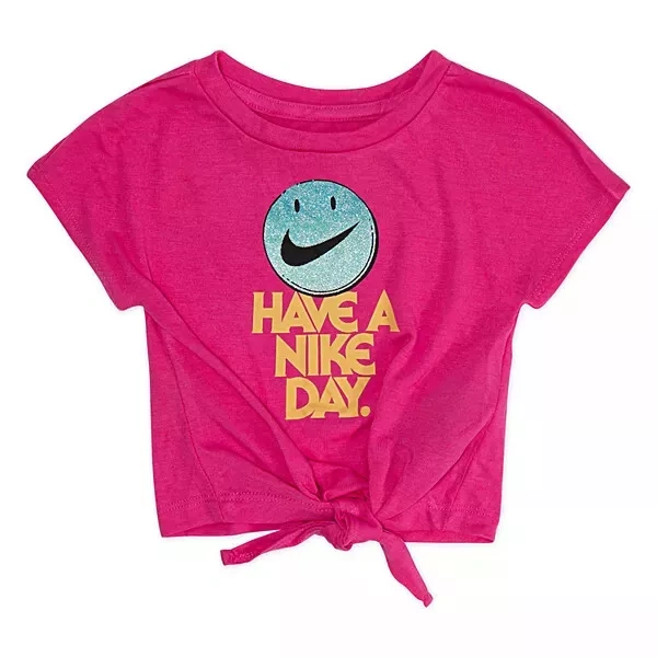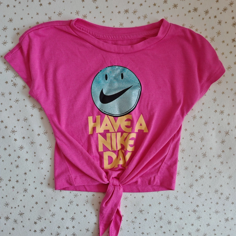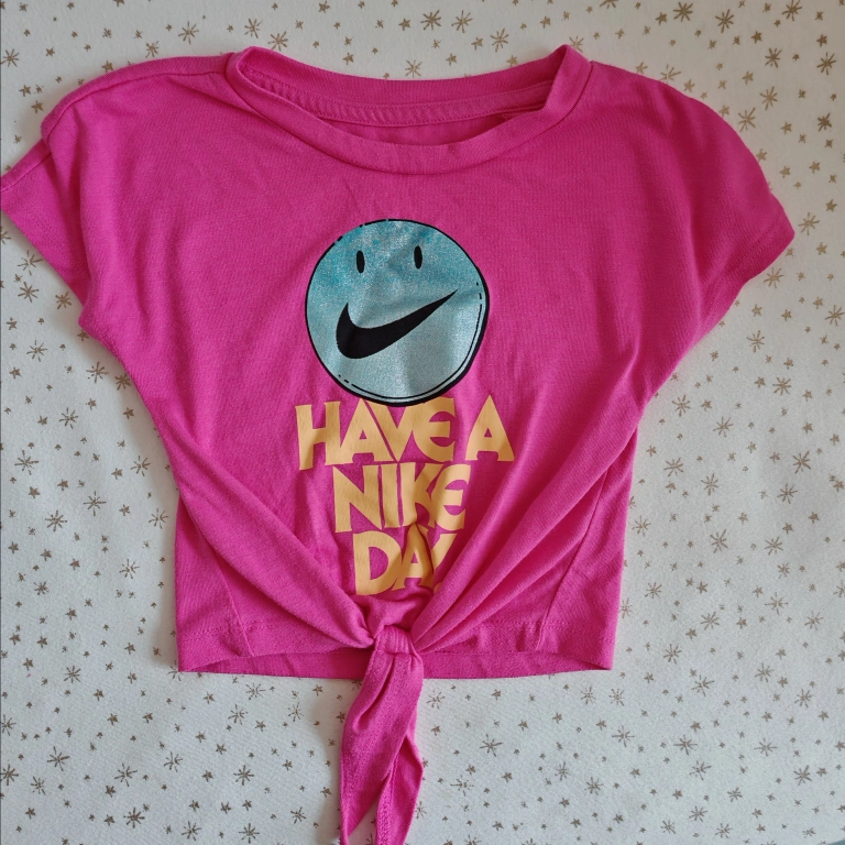 Adorable Nike tee. Features a smiley face graphic and the text "Have a Nike Day." Pink colour. Size 4. Made in Vietnam.