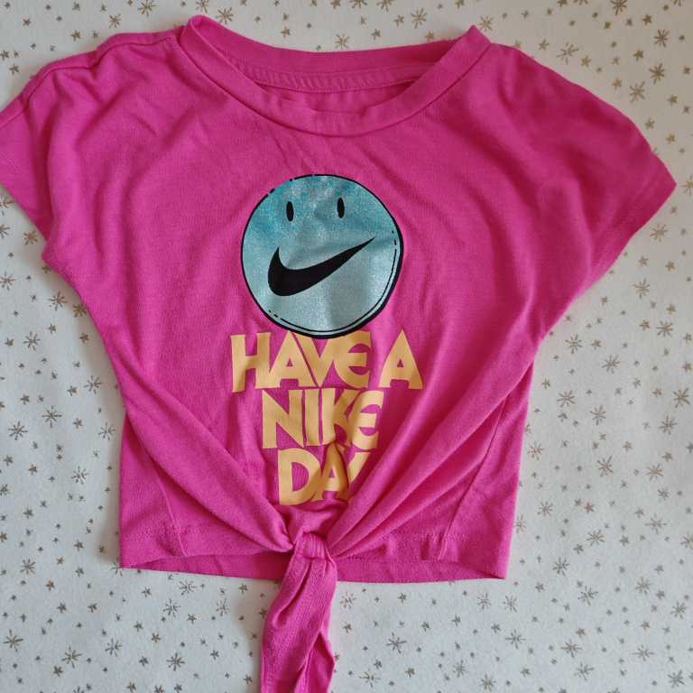 Adorable Nike tee. Features a smiley face graphic and the text "Have a Nike Day." Pink colour. Size 4. Made in Vietnam.