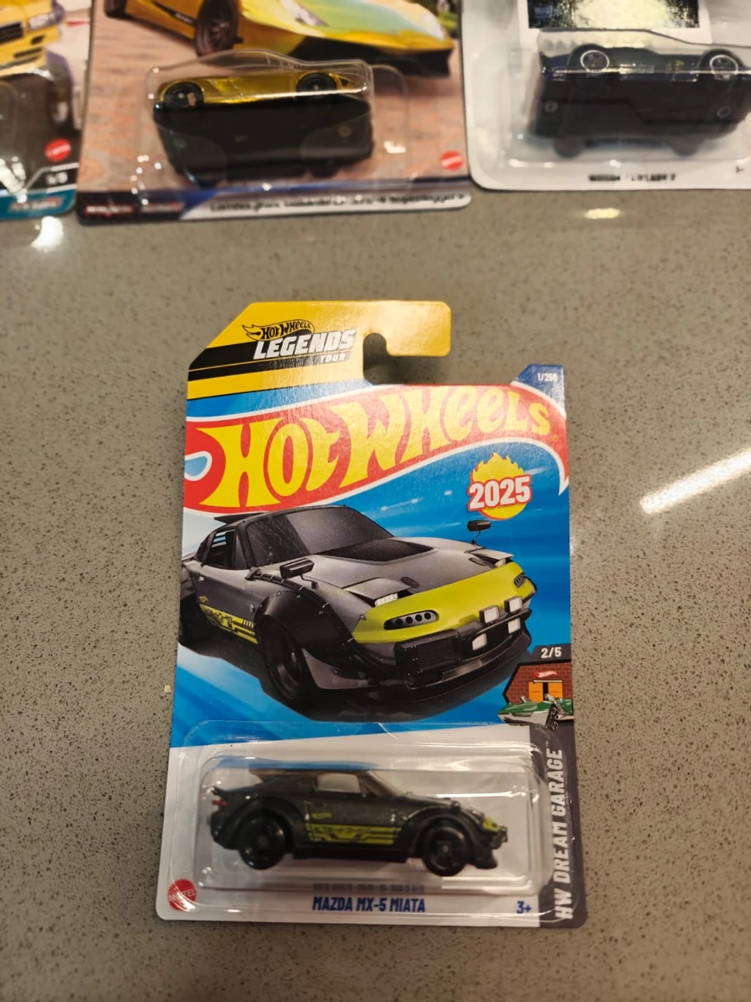 This is a Hot Wheels Legends Tour 2025 Mazda MX-5 Miata die-cast car. It's part of the HW Dream Garage series. Recommended for ages 3 and up.