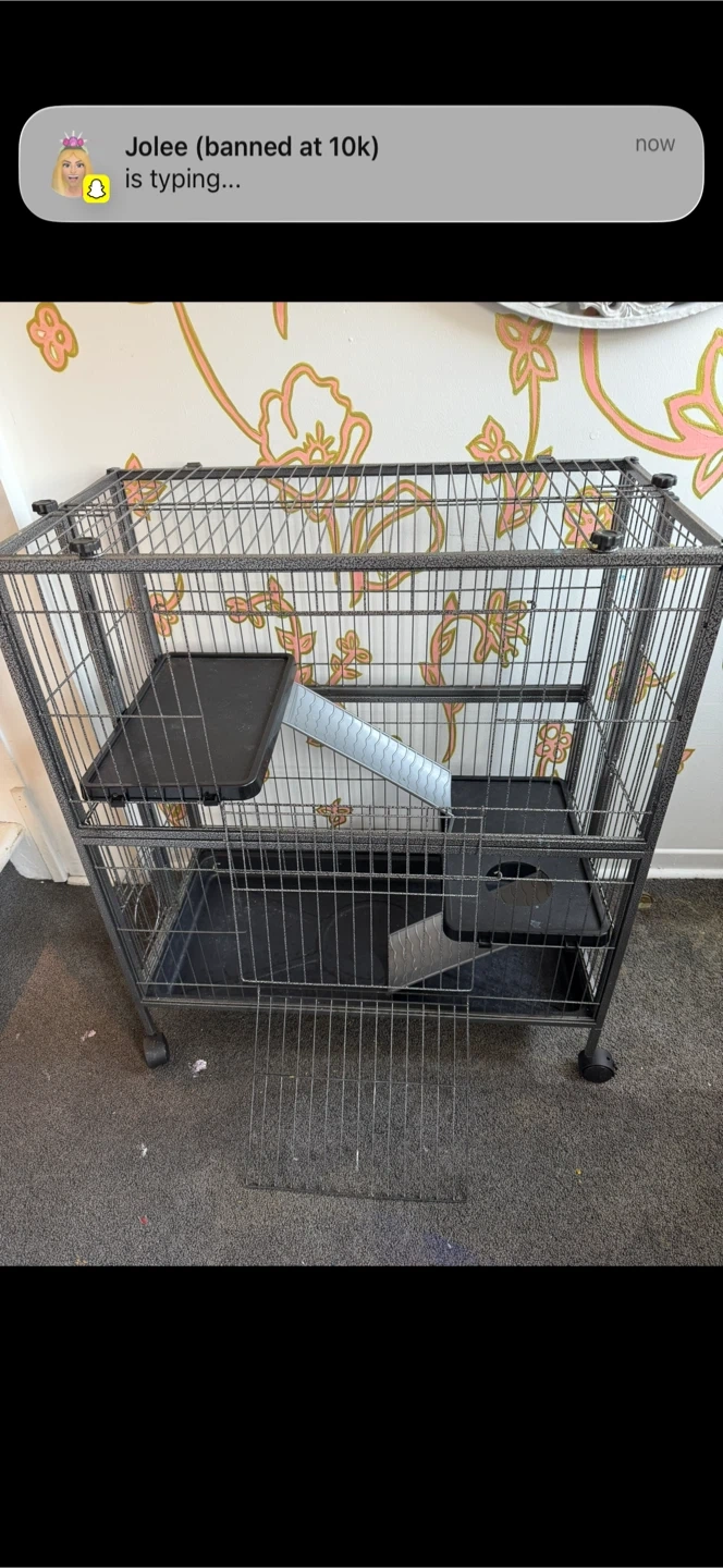 This multi-level cage provides ample space for small pets. It includes two platforms and two ramps for easy navigation. The cage is made of durable metal wire with a grey speckled finish and sits on wheels for mobility. Easy to clean with pull out trays.