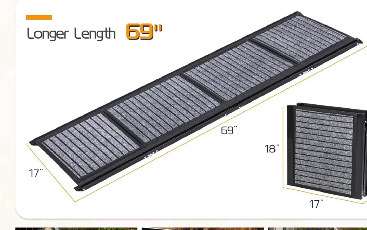 This is a foldable dog ramp. It's 69 inches long, 17 inches wide, and 18 inches high when folded. Features a textured surface for grip. Great for helping pets access vehicles or furniture!
