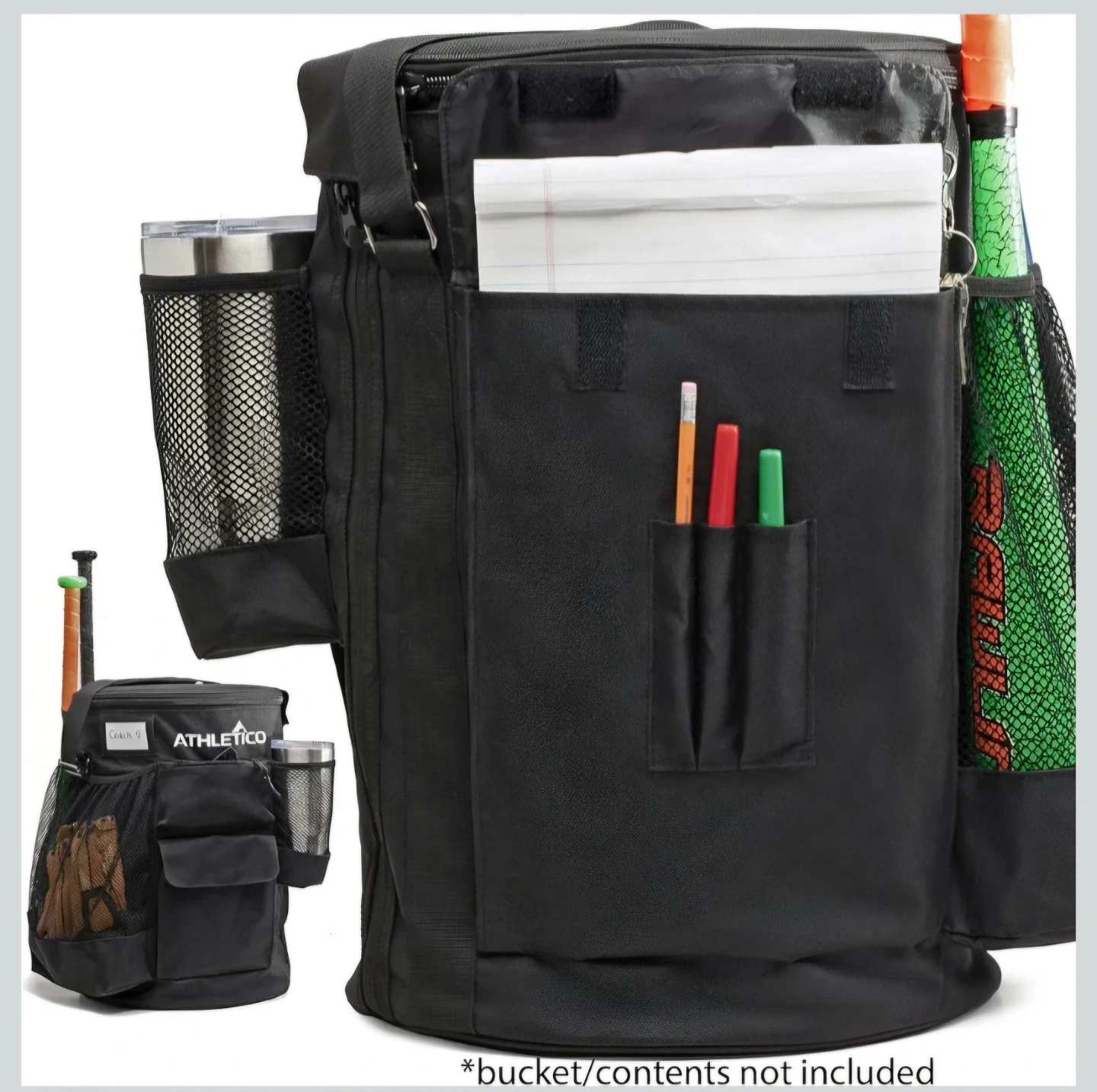This Athletico baseball bucket organizer fits over a 6-gallon bucket and provides 10 pockets for gear. It's made of durable black fabric and includes mesh pockets for water bottles and bats. It helps keep baseball equipment tidy and accessible!