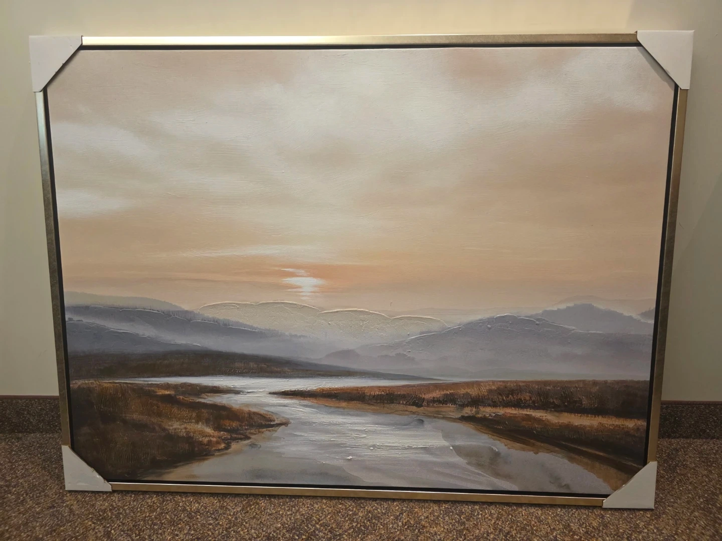 NEW!! Beautiful canvas painting of a serene landscape with rolling hills and a river at sunset. On trend design will compliment any decor. The textured brushstrokes add depth to the scene. Champagne floating frame. Ready to hang!