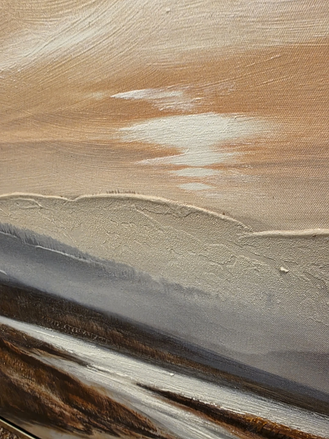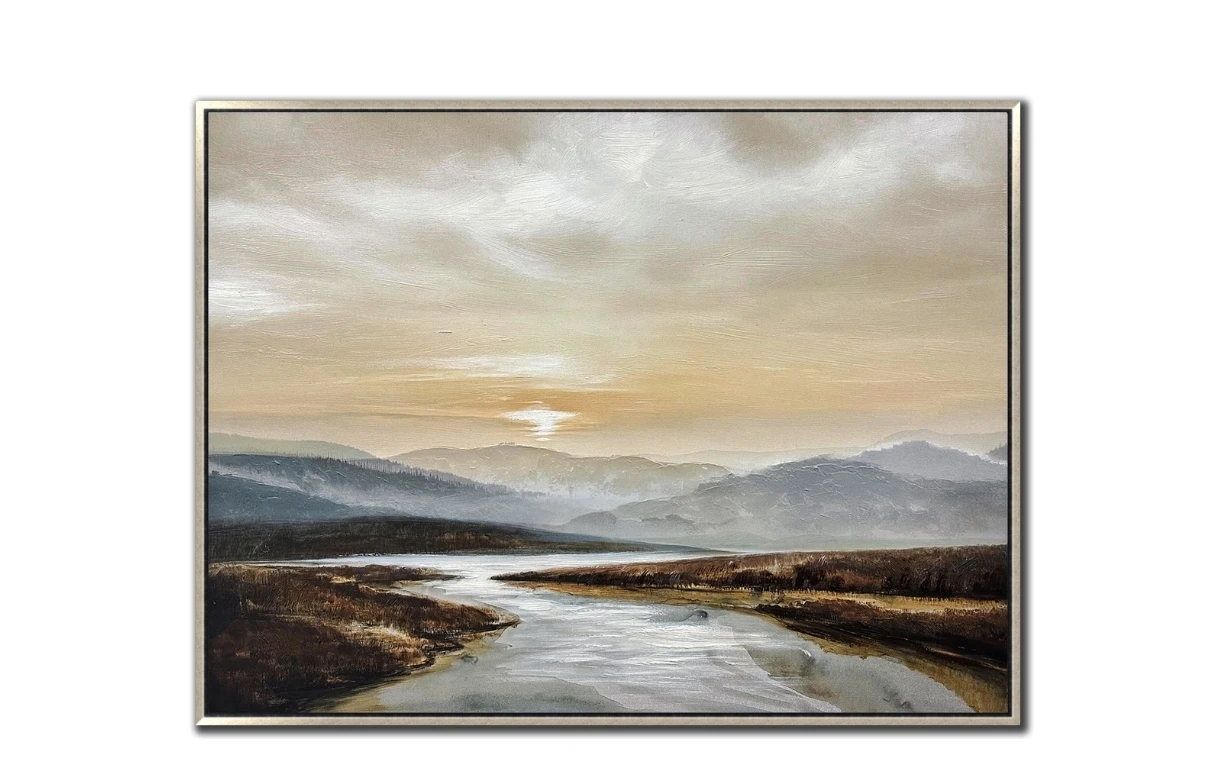 NEW!! Beautiful canvas painting of a serene landscape with rolling hills and a river at sunset. On trend design will compliment any decor. The textured brushstrokes add depth to the scene. Champagne floating frame. Ready to hang!