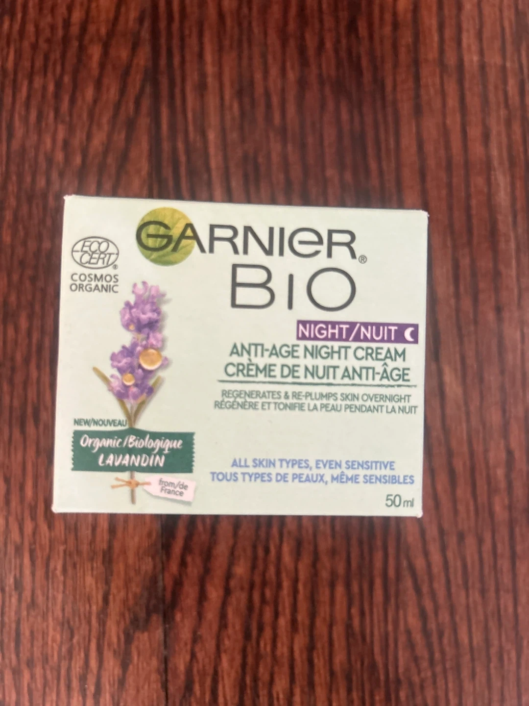 Garnier BIO Organic Lavandin Anti-Age Night Cream regenerates and re-plumps skin overnight. It's for all skin types, even sensitive. The cream is 50ml.