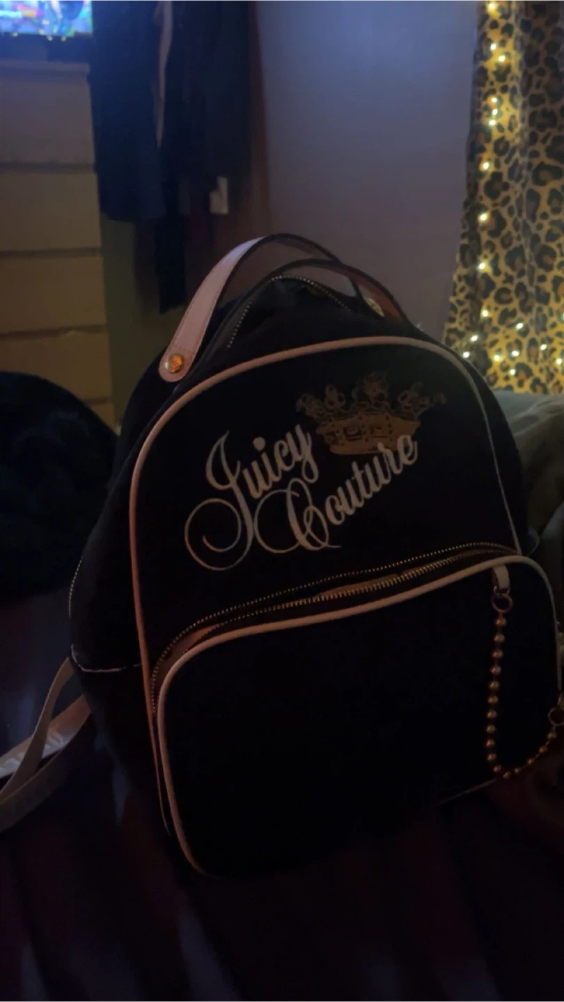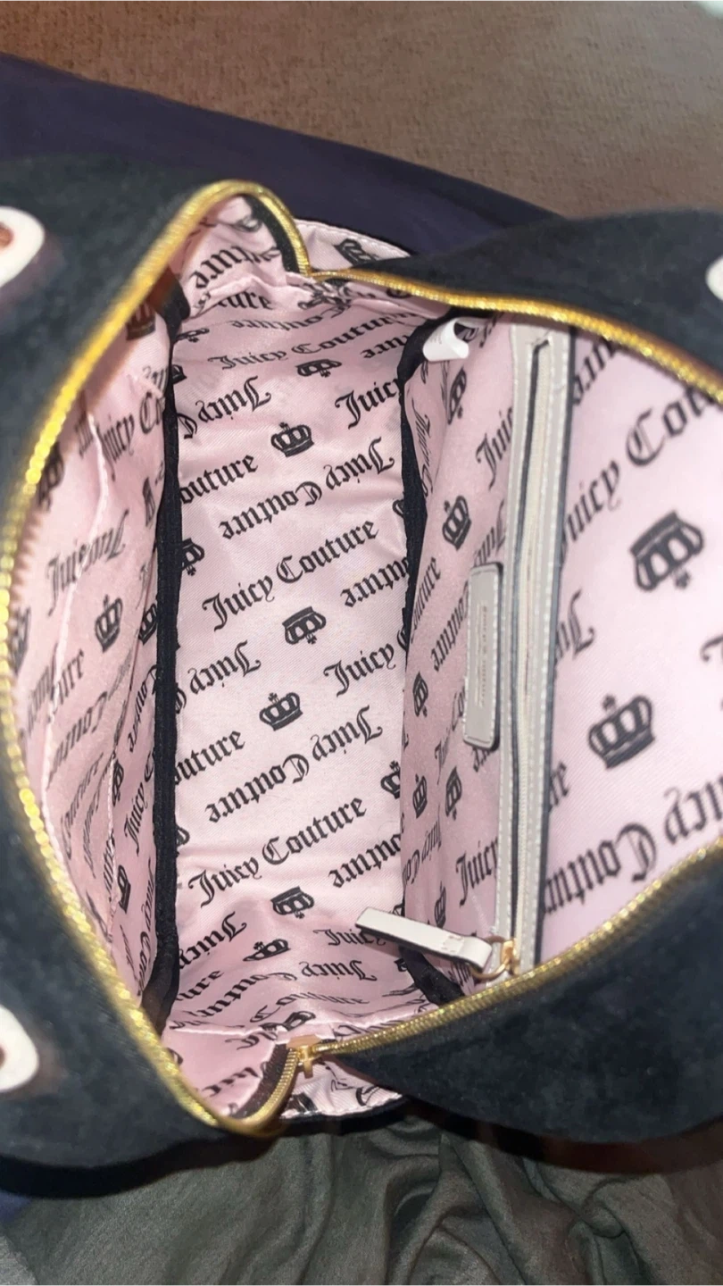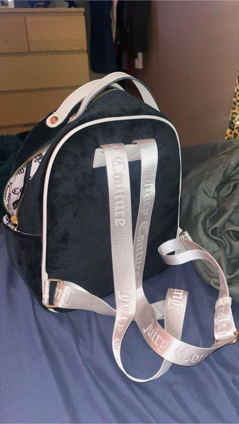 This black velour mini backpack features the Juicy Couture logo on the front and straps. The interior has a pink lining with the repeating Juicy Couture pattern. It has a main zippered compartment and a front zippered pocket.