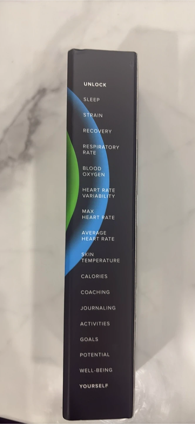 This is a WHOOP 4.0 fitness tracker system. It includes the hardware, an Onyx Superknit band, and a battery pack. It monitors sleep, strain, recovery, respiratory rate, blood oxygen, and heart rate metrics.