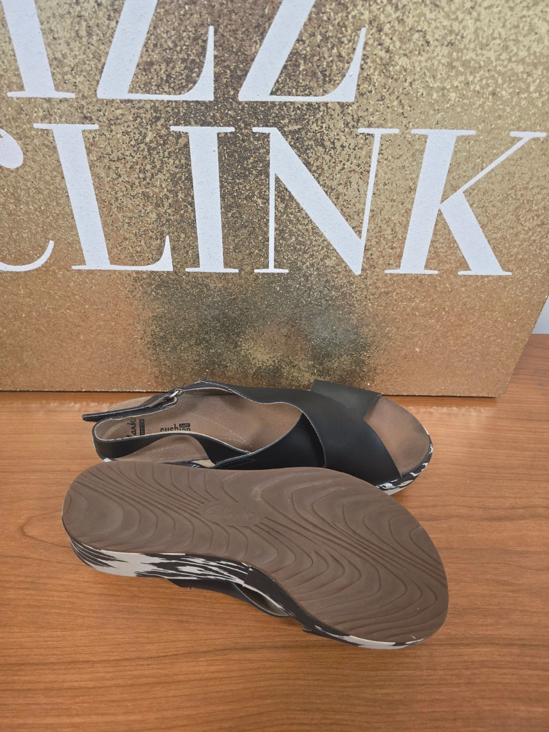 Clarks women's sandals with a comfortable cushioned footbed. Black leather criss-cross straps and a black and white patterned wedge sole. Adjustable ankle strap.
