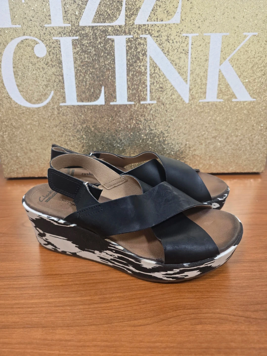 Clarks women's sandals with a comfortable cushioned footbed. Black leather criss-cross straps and a black and white patterned wedge sole. Adjustable ankle strap.