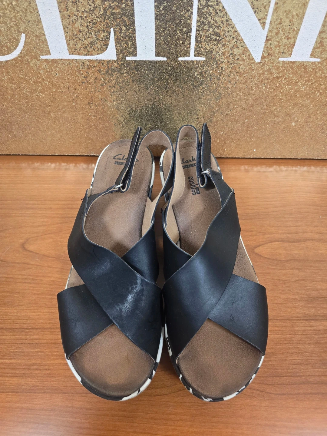 Clarks Black Leather Strappy Wedge Sandals
