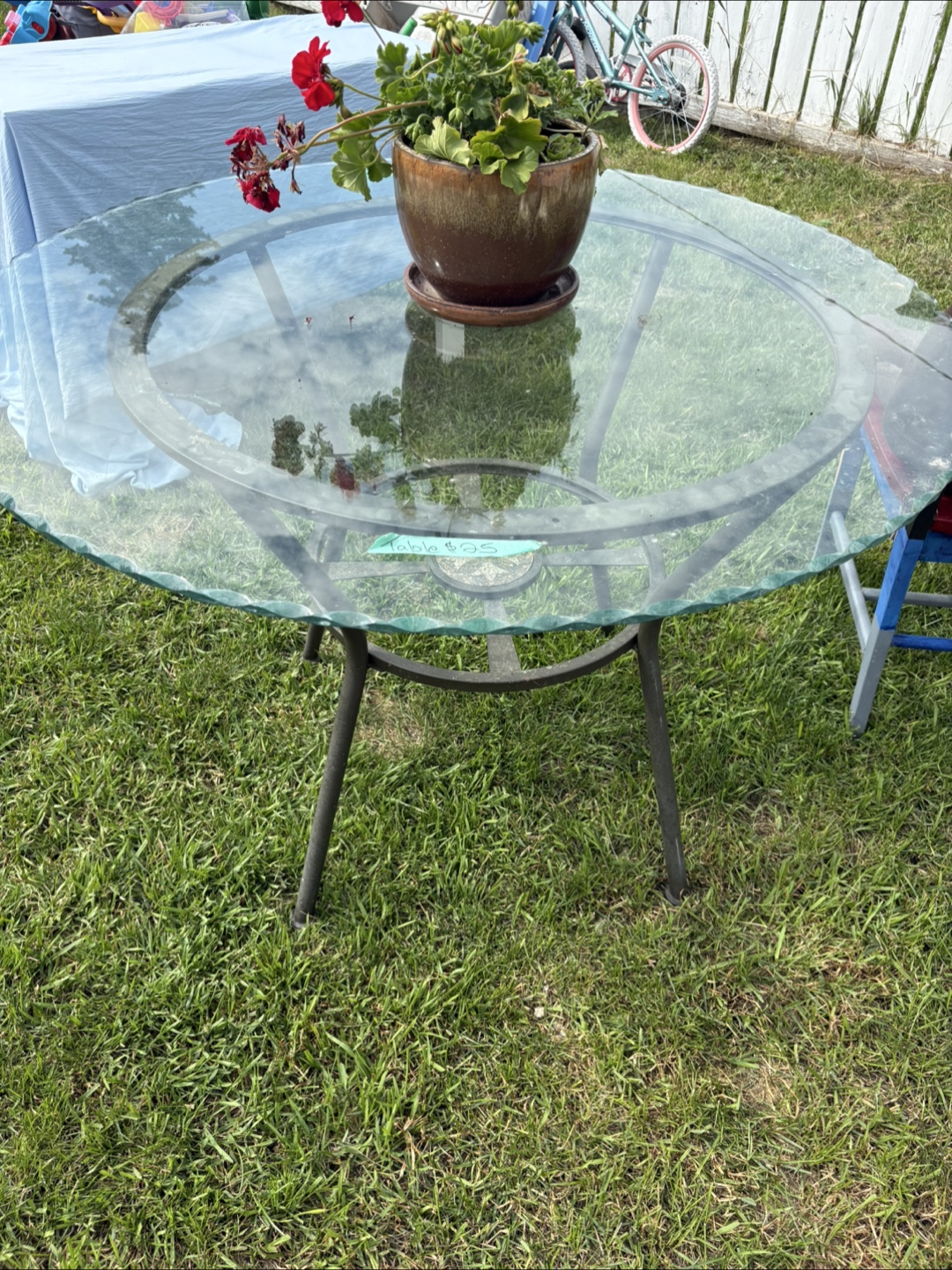 Selling a glass top outdoor table! It's in good condition and ready for your patio or garden. The table has a metal frame and a clear glass top. The top has a beautiful edging to it. Pick up in Forest lawn FCFS.