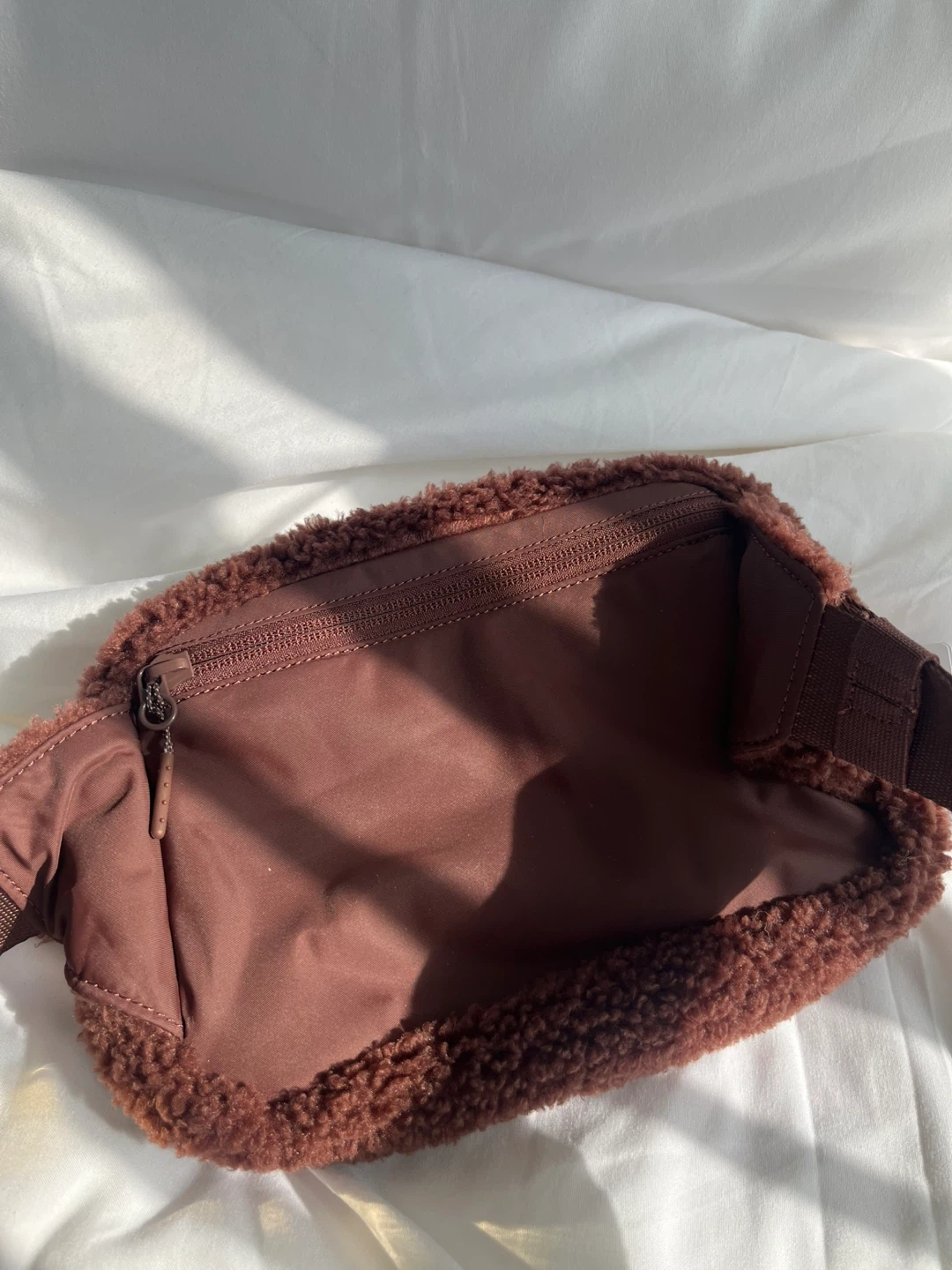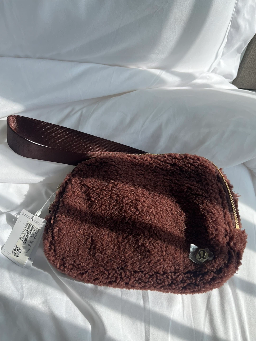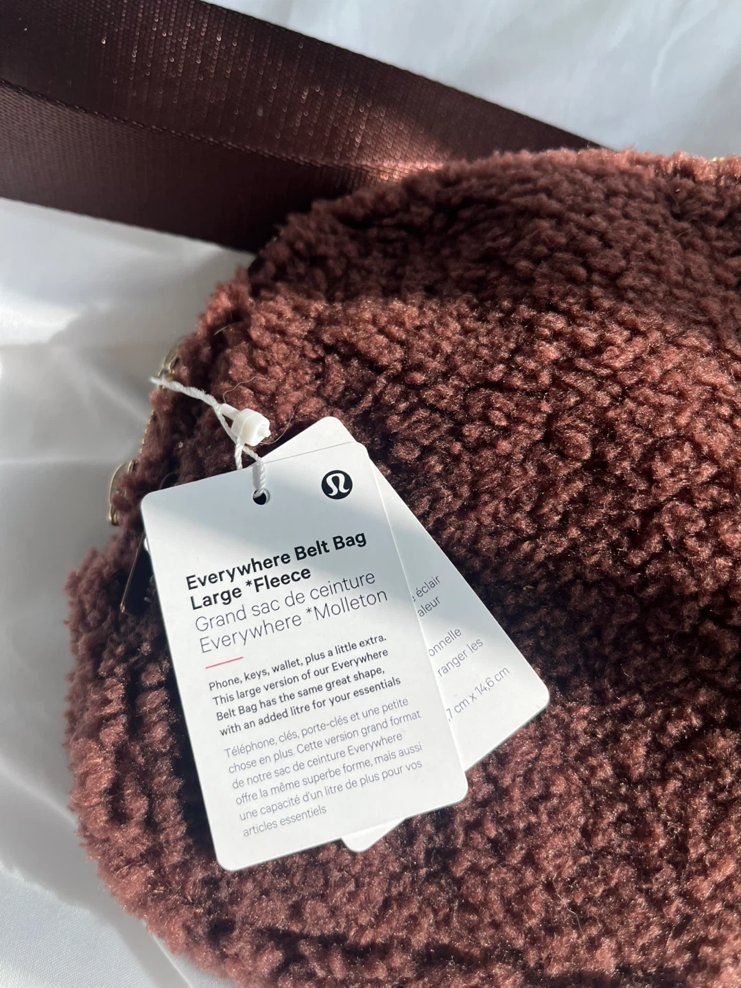 This Lululemon Everywhere Belt Bag is the large fleece version in Molleton Brindle Gold. It features textured fleece fabric and an exterior zippered pocket for your valuables. The two-way zipper and interior pockets keep your essentials secure. Dimensions are 21cm x 5.7cm x 14.6cm, with a volume of 2L.
