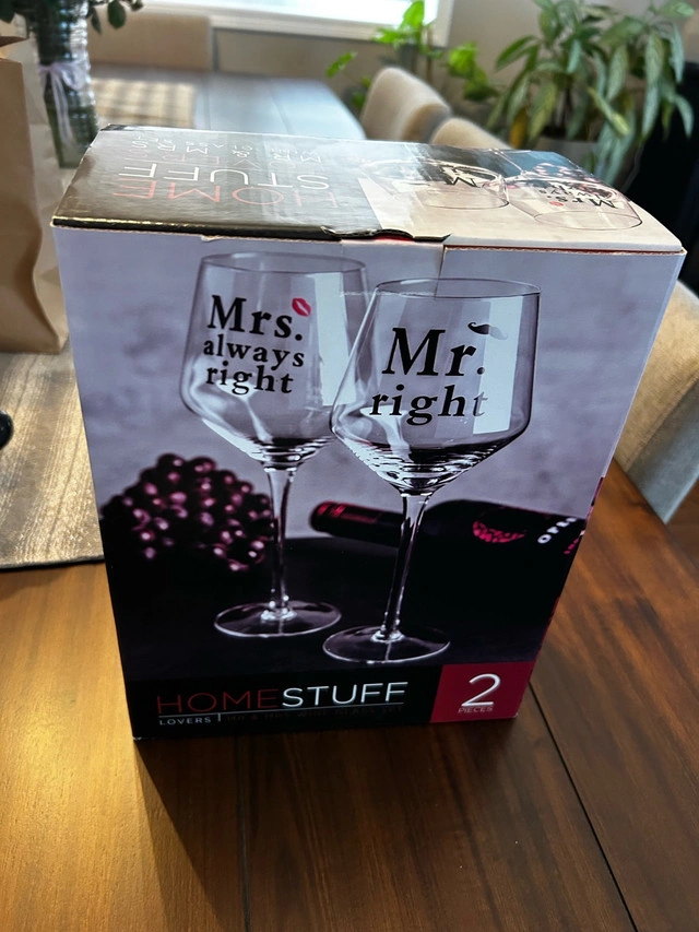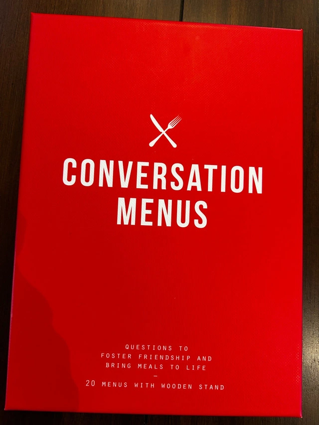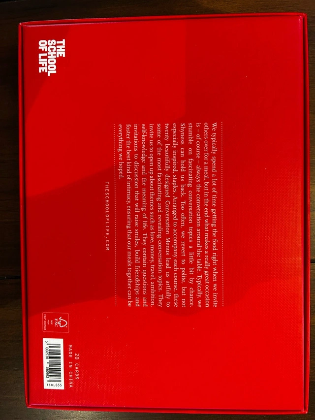 Add some spice to your next dinner party with this HOMESTUFF Mr. Right and Mrs. Always Right wine glass set, complete with the original box and ready to add a touch of humour and elegance to your table. For deeper conversations, dive into "The School of Life" Conversation Menus. This brand-new set features thought-provoking questions on a wooden stand, perfect for sparking engaging discussions and fostering friendship around the dinner table. Brand new in the box.