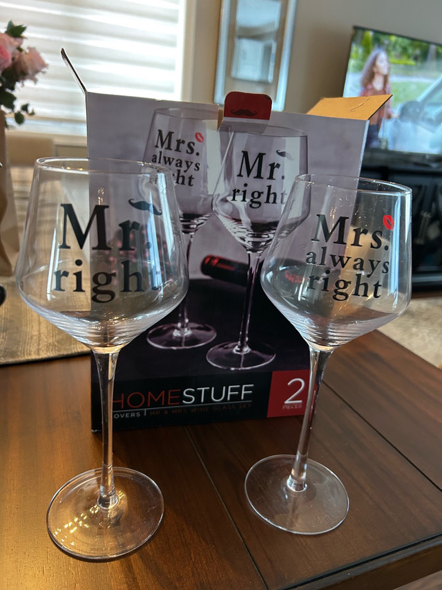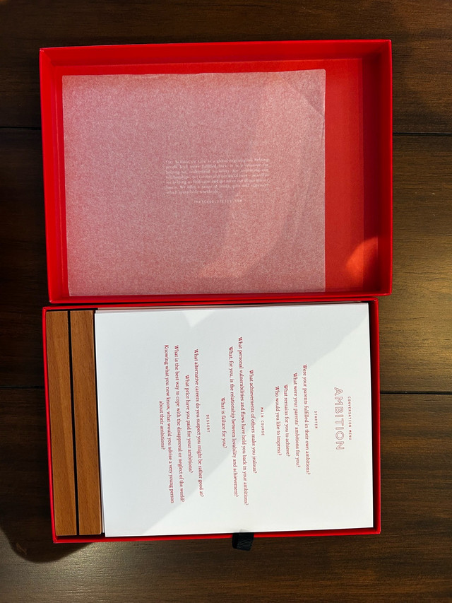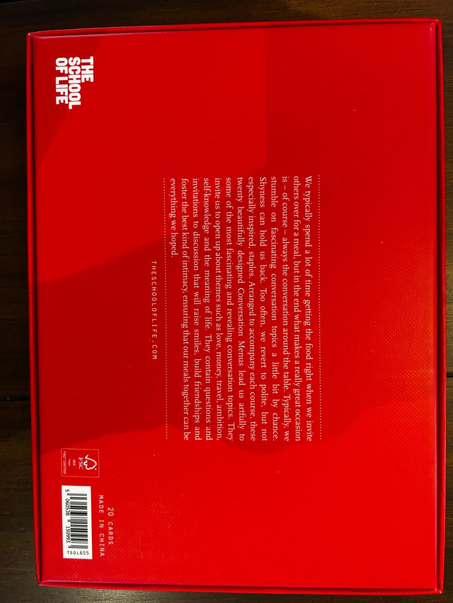 Add some spice to your next dinner party with this HOMESTUFF Mr. Right and Mrs. Always Right wine glass set, complete with the original box and ready to add a touch of humour and elegance to your table. For deeper conversations, dive into "The School of Life" Conversation Menus. This brand-new set features thought-provoking questions on a wooden stand, perfect for sparking engaging discussions and fostering friendship around the dinner table. Brand new in the box.