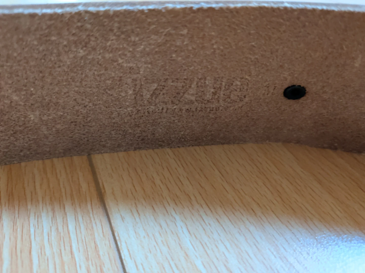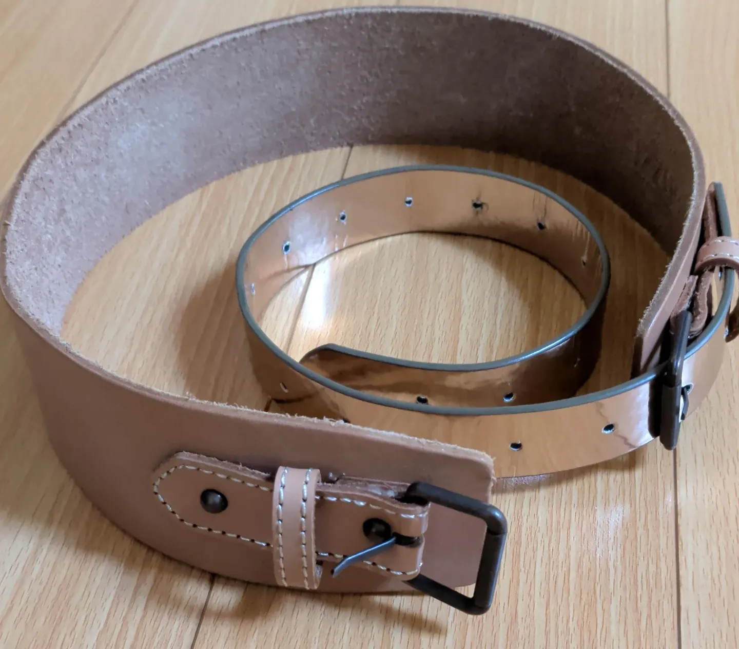 This is a tan Izzue leather belt. It features a shiny metallic interior. Made with quality leather. Size M